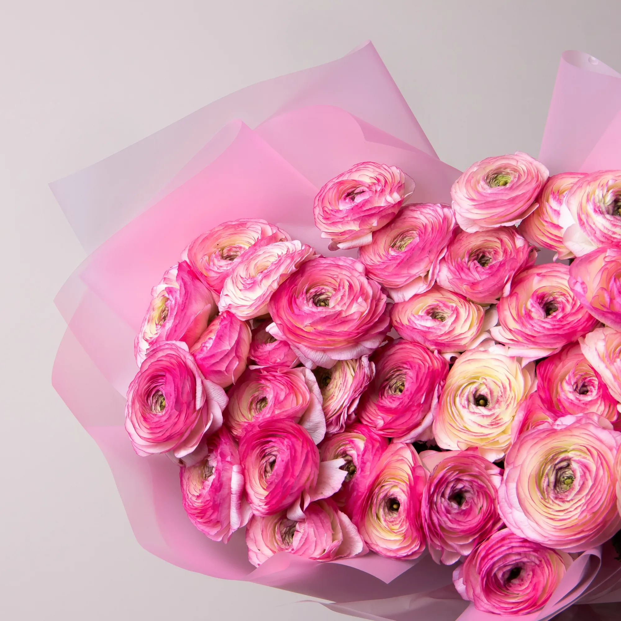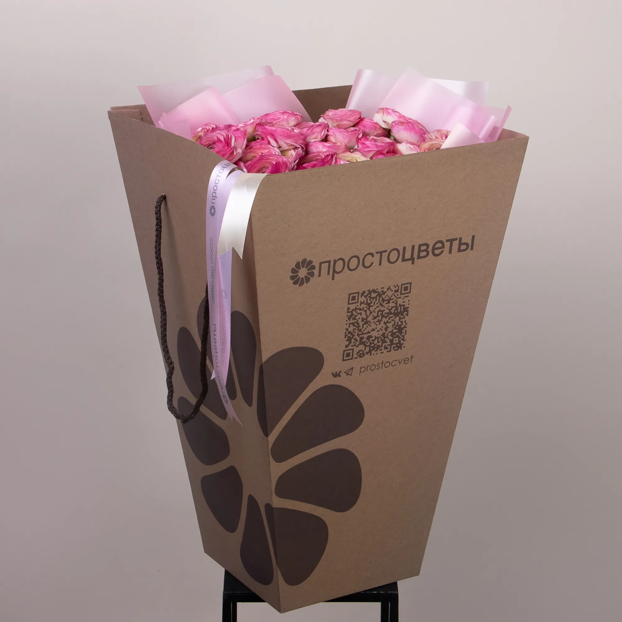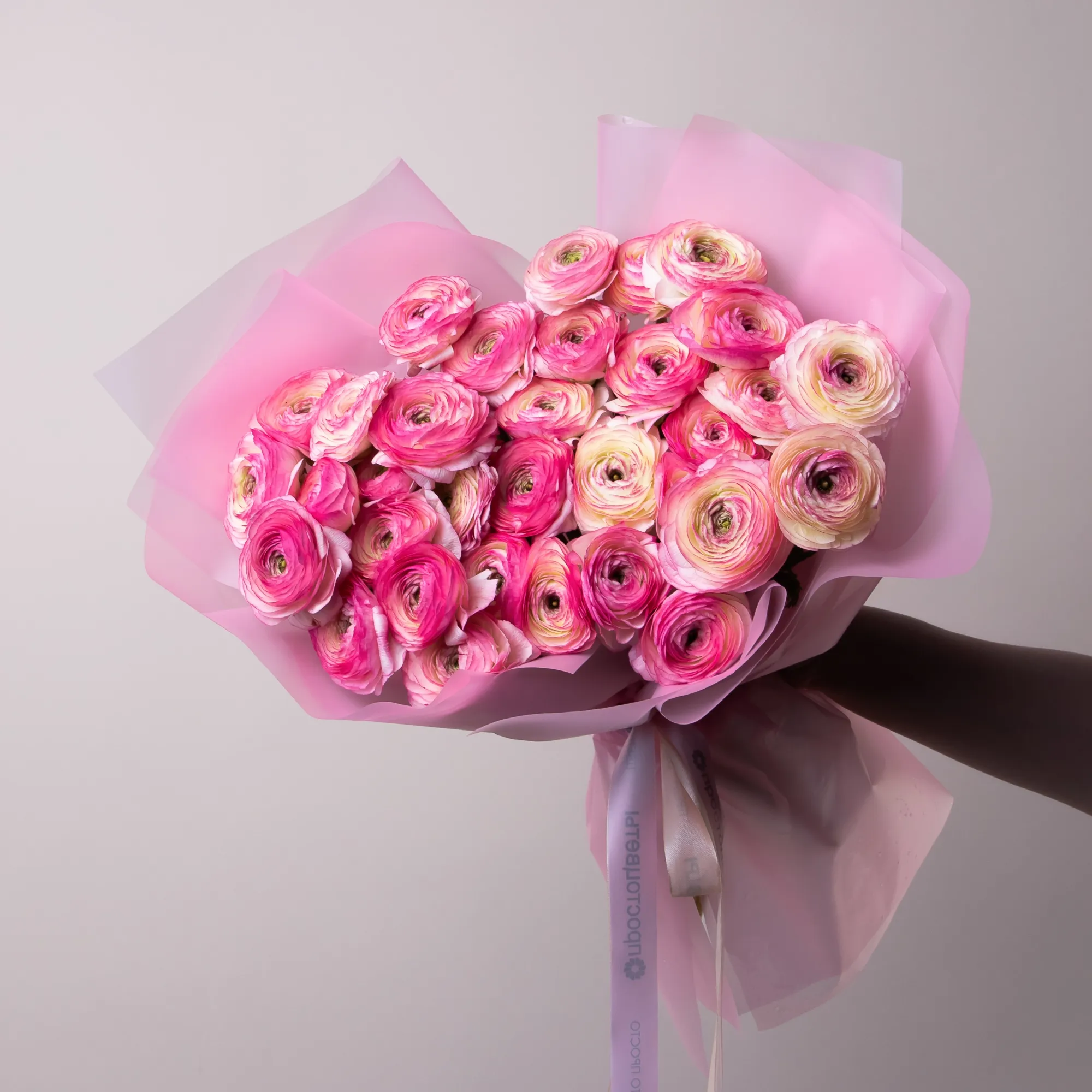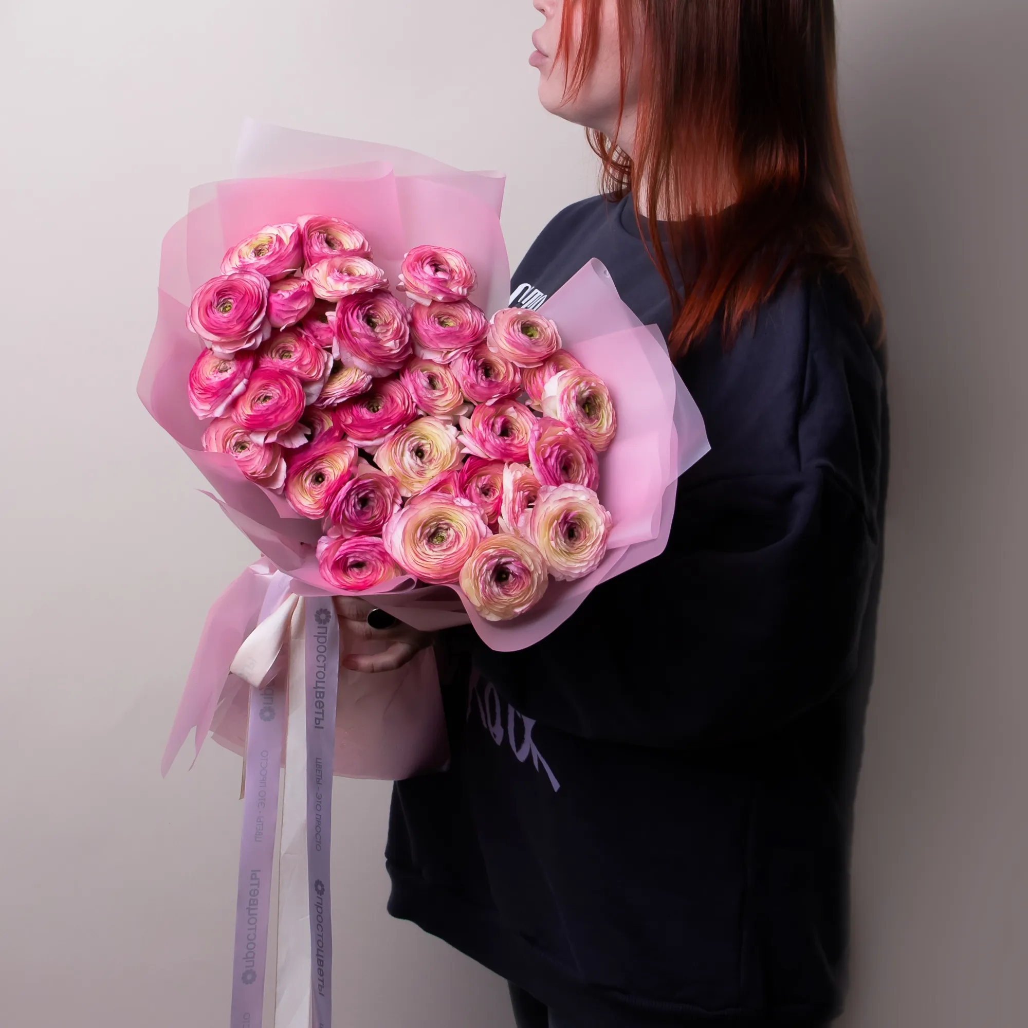Букет Ранункулус "Клуни Фелицитед Дарк" из 35 розовых ранункулус высотой 60 см красиво упакуем