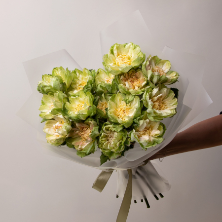 Букет с розой сорта Вегги — это настоящее произведение искусства, созданное природой и руками мастеров. Этот уникальный сорт роз поражает своей красотой и элегантностью.