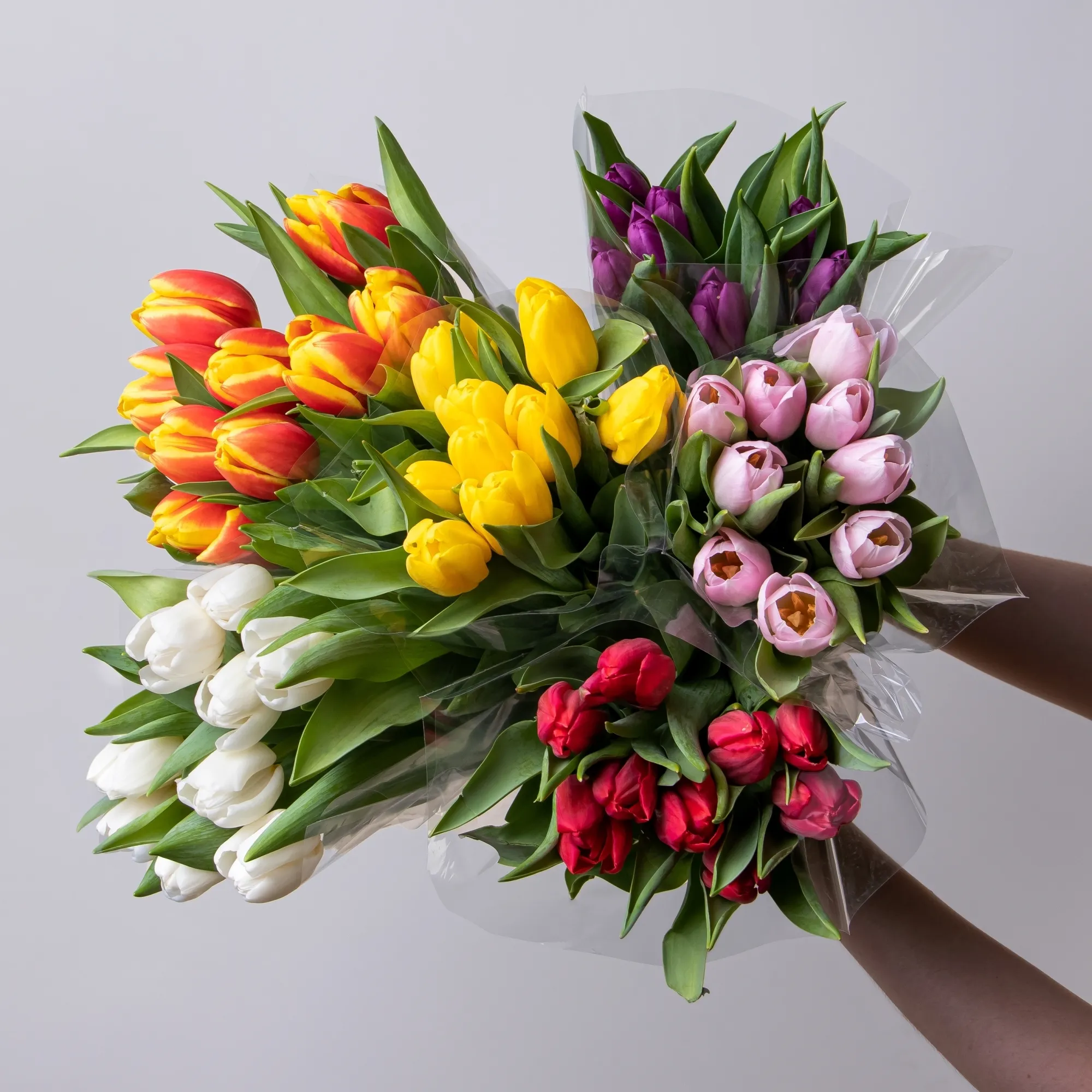 Букеты 9тюльпанов, в прозрачной упаковке, миксовых цветов.