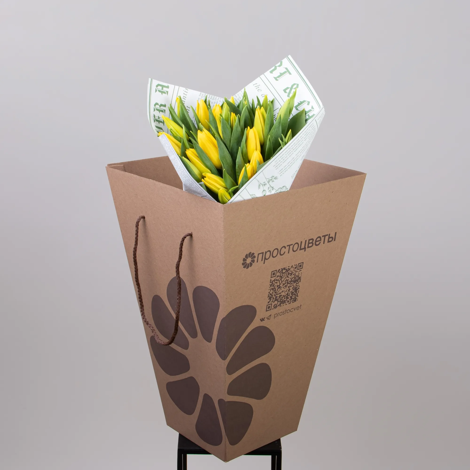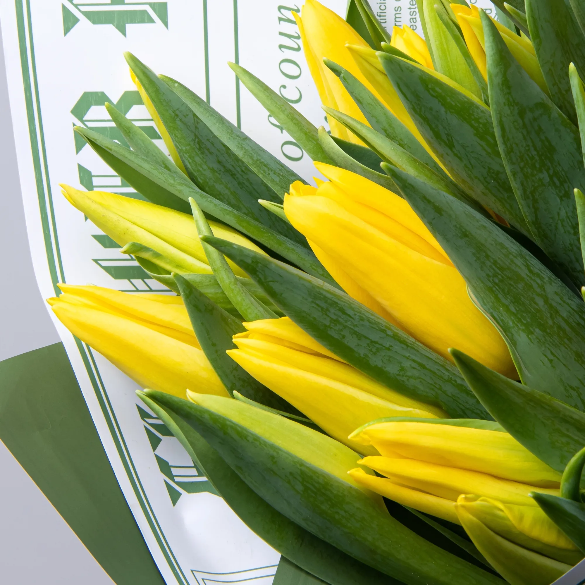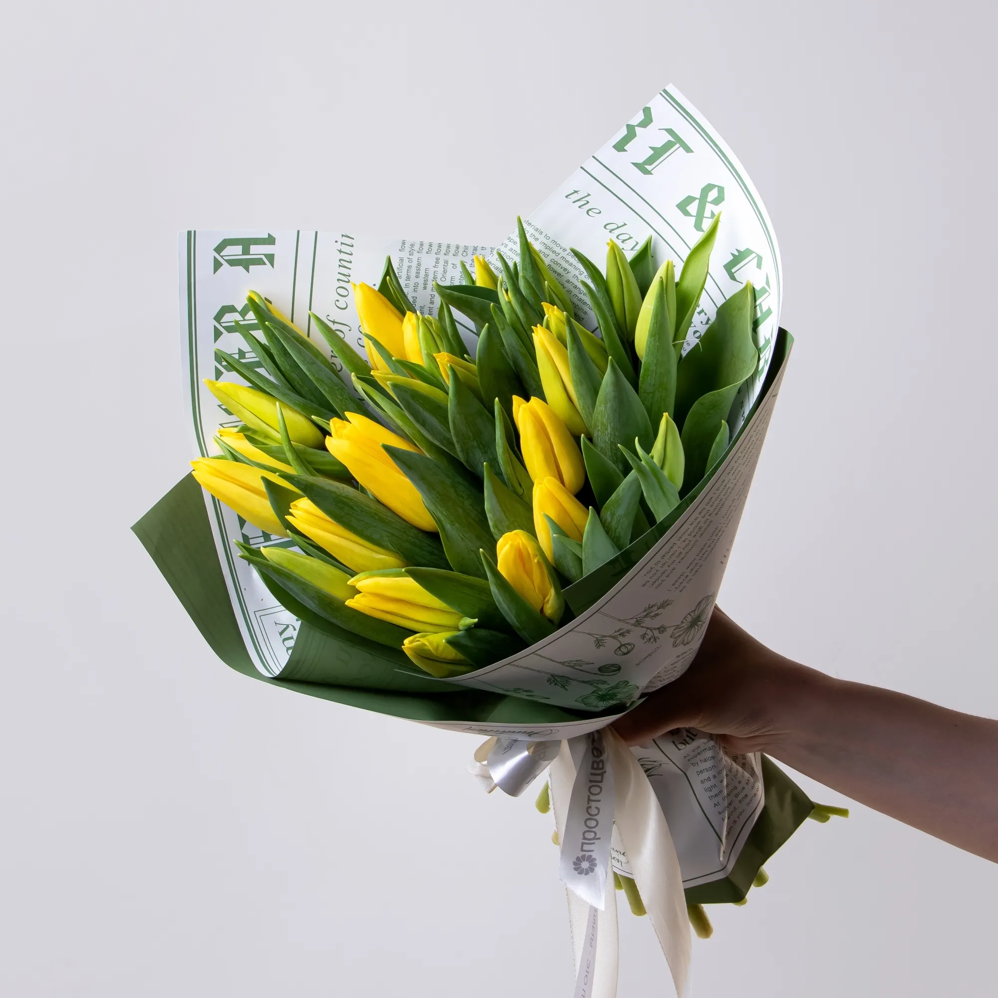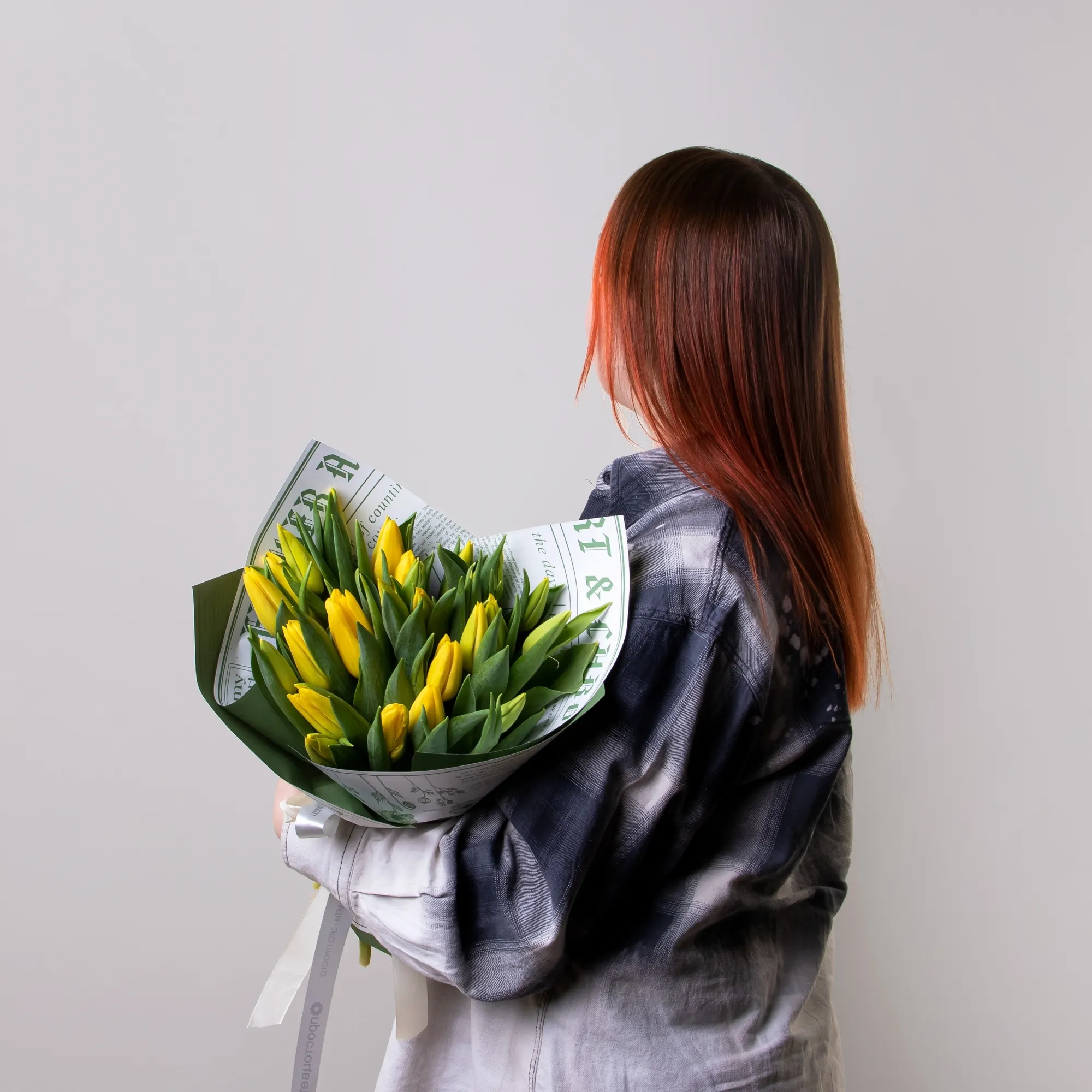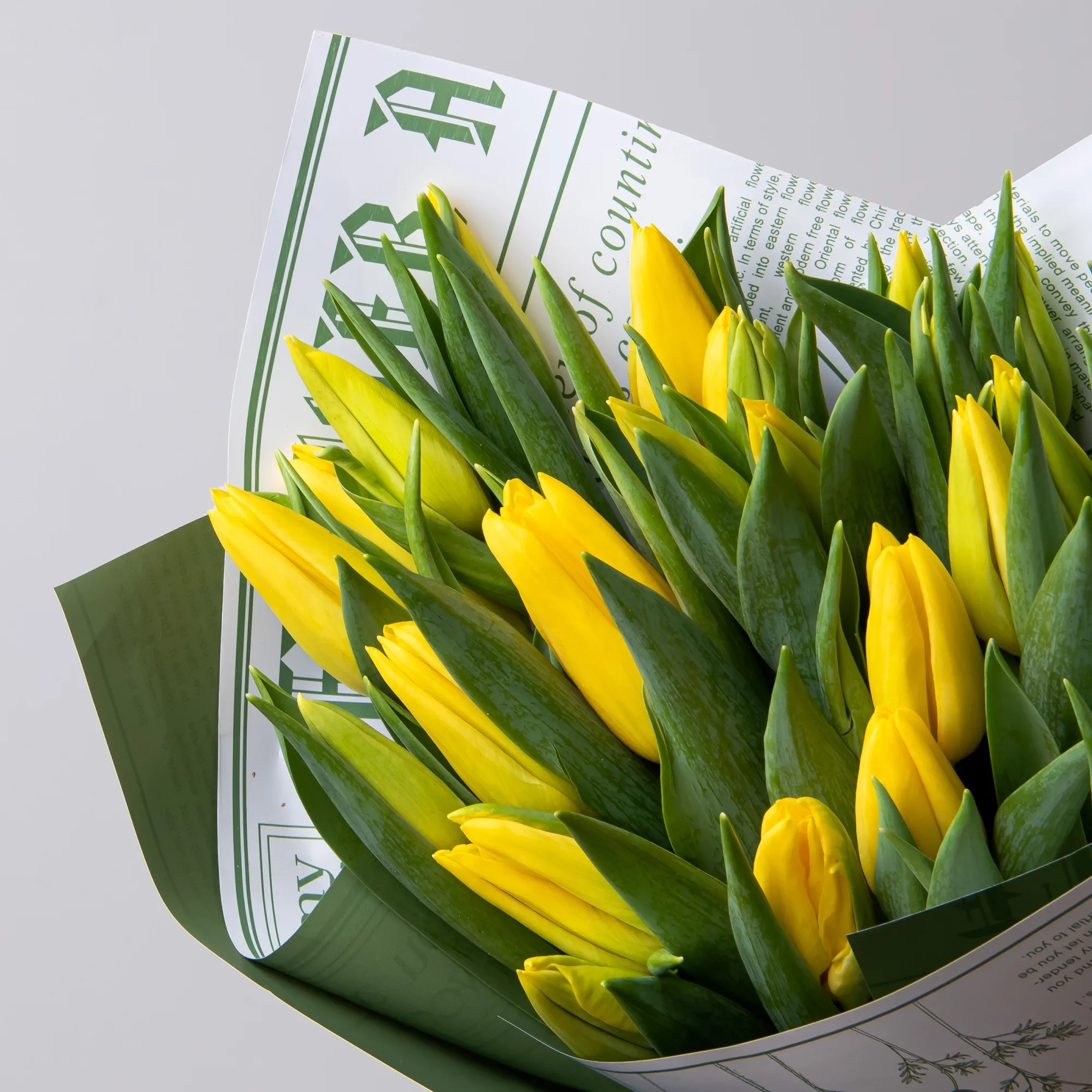 Наши тюльпаны сорта «Эн Стронг Голд» приезжают в Россию напрямую со старинных плантаций в Нидерландах, где этот сорт вывели сто лет назад. В пути цветы спят при температуре + 4 градуса. Те же условия мы поддерживаем в производственных цехах, где начинается вторая жизнь растений. Первым делом флористы очищают стебли от лишних листьев, чтобы предотвратить преждевременное гниение. Затем, используя различные техники, собирают букеты, оборачивают их в бумагу, фоамиран или фетр, подрезают стебли. В сосуды с водой обязательно добавляют флористическую подкормку кризал, которая смягчает последствия стресса после срезки и обеспечивает цветам питание. Перед отправкой к покупателям букеты хранятся при температуре +6 градусов.