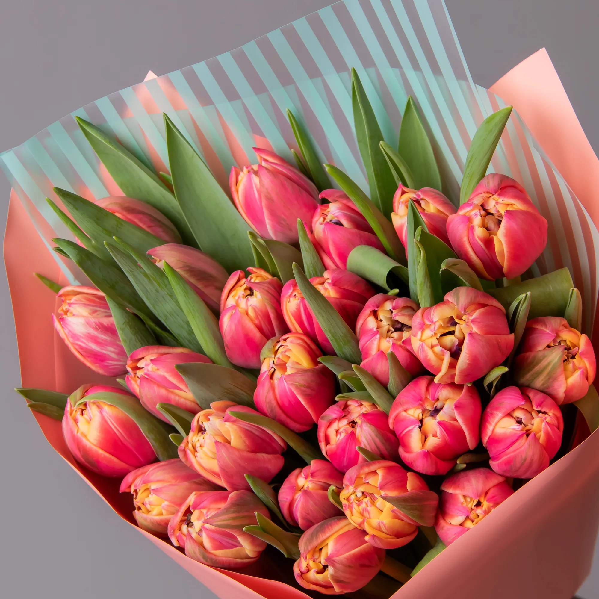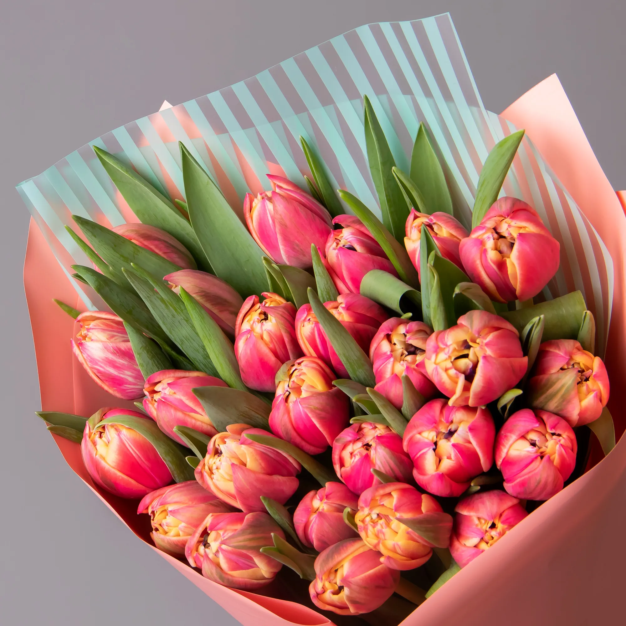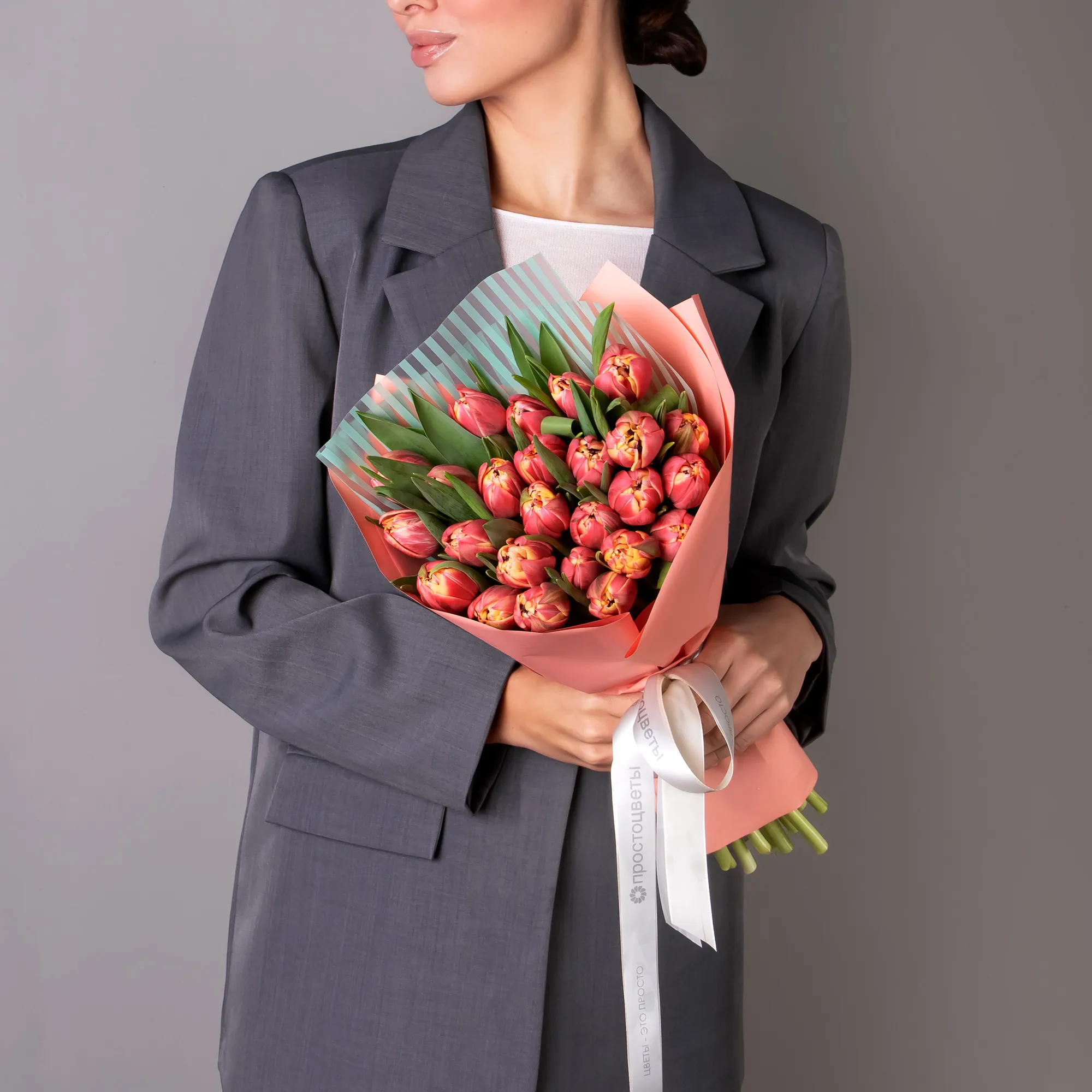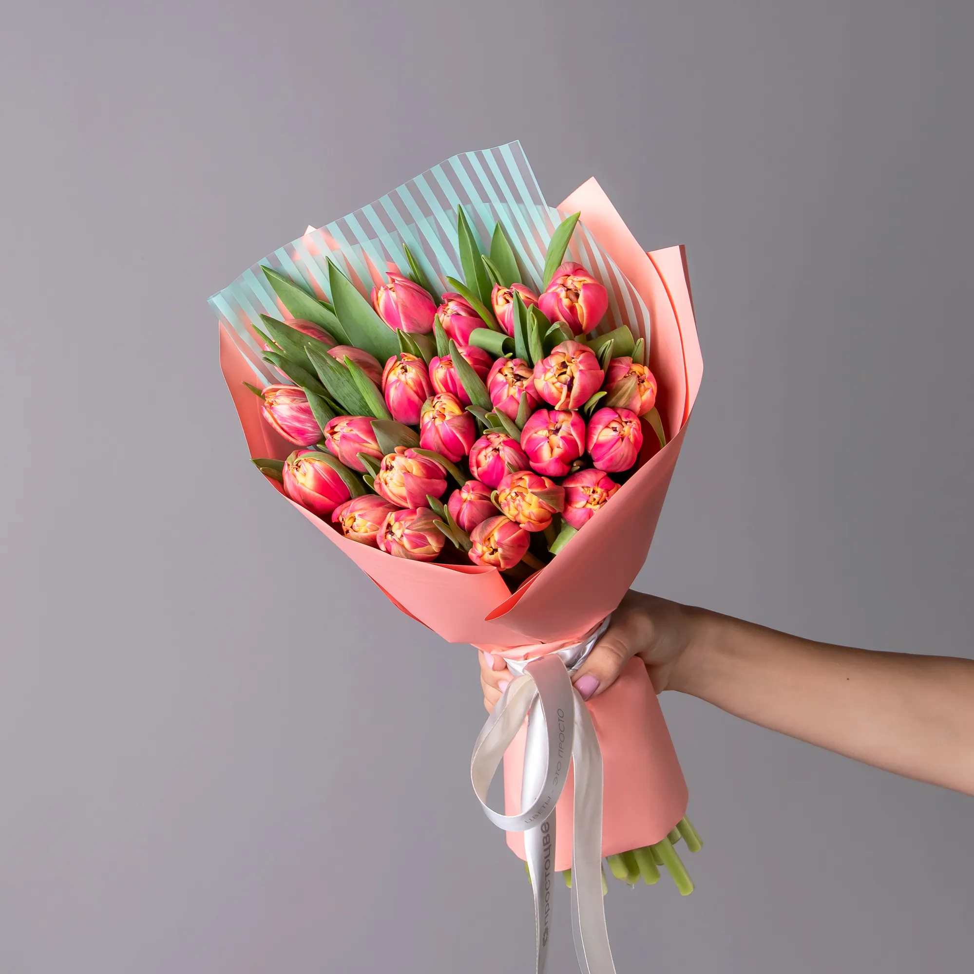 На фотографии представлен букет из 50 стеблей тюльпанов.