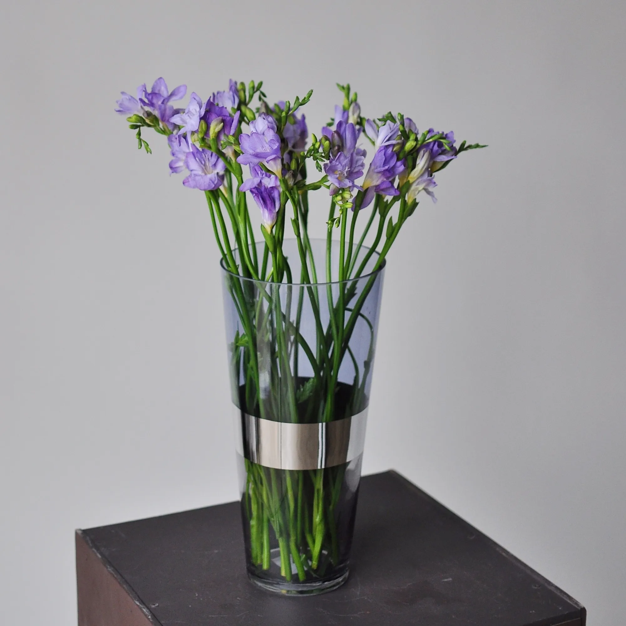 Ваза из плотного стекла синего цвета. Декорирована серебряной широкой полосой.