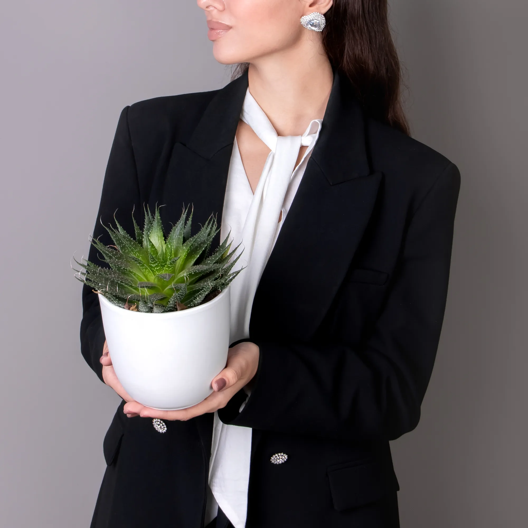 Как правило, растения доставляются в техническом пластиковом горшке от поставщика. Если в наименовании указано «в керамике/цинке», то в эту стоимость входит декоративное кашпо.