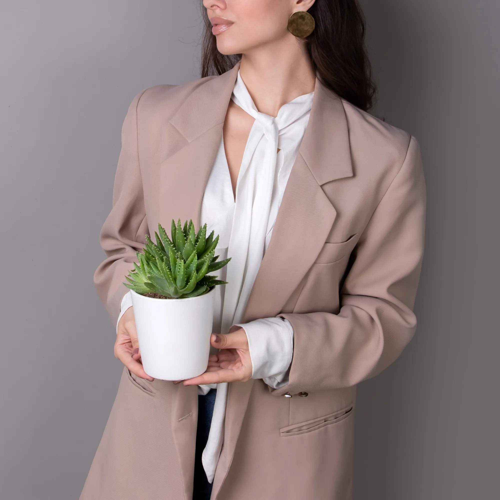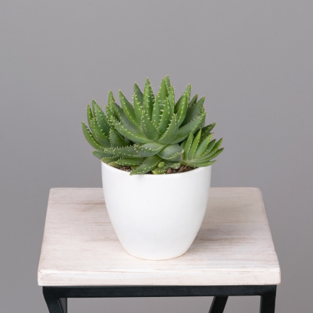 Как правило, растения доставляются в техническом пластиковом горшке от поставщика. Если в наименовании указано «в керамике/цинке», то в эту стоимость входит декоративное кашпо.