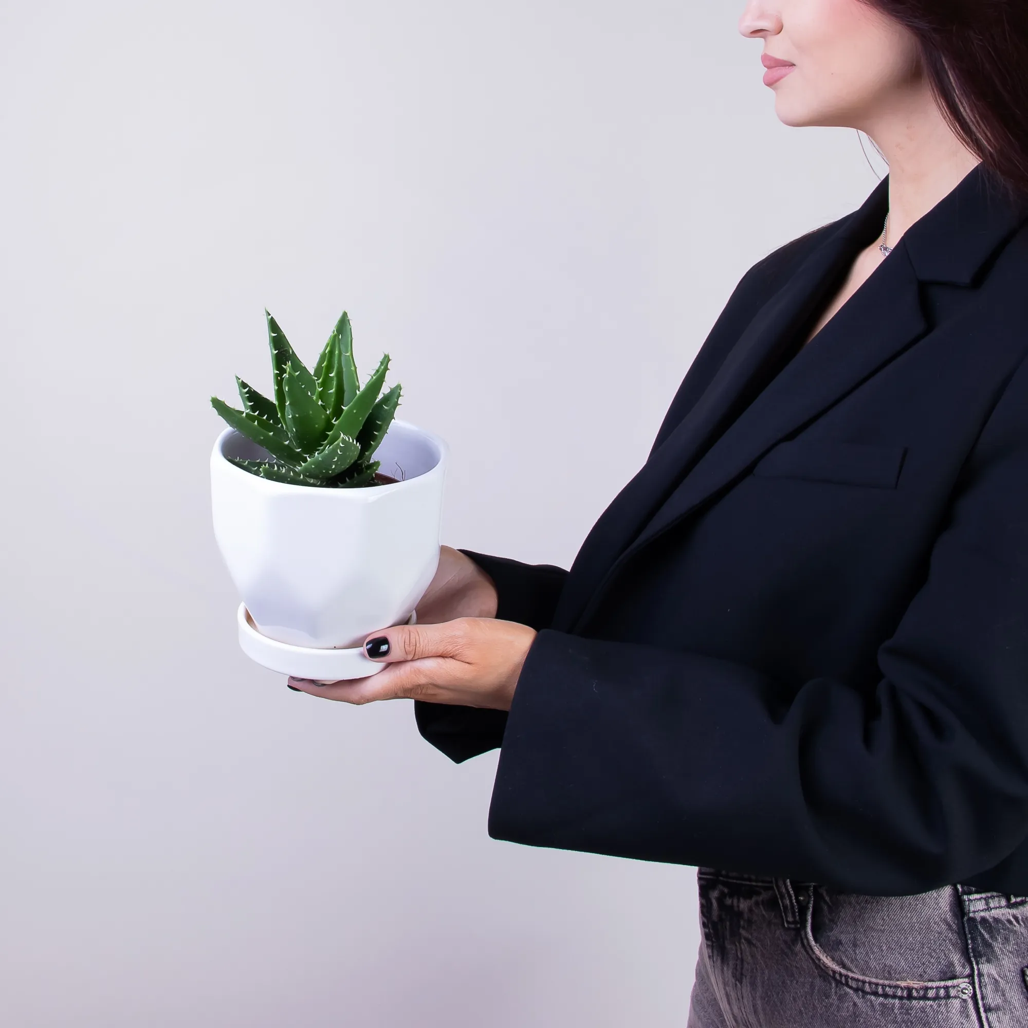 Как правило, растения доставляются в техническом пластиковом горшке от поставщика. Если в наименовании указано «в керамике/цинке», то в эту стоимость входит декоративное кашпо.