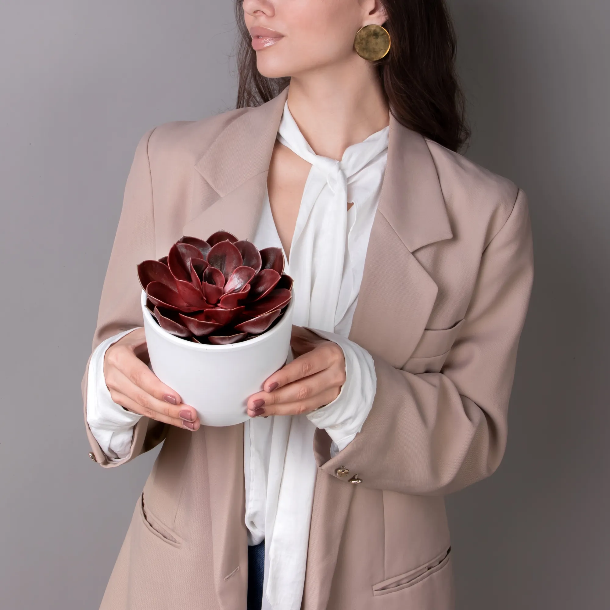 Как правило, растения доставляются в техническом пластиковом горшке от поставщика. Если в наименовании указано «в керамике/цинке», то в эту стоимость входит декоративное кашпо.