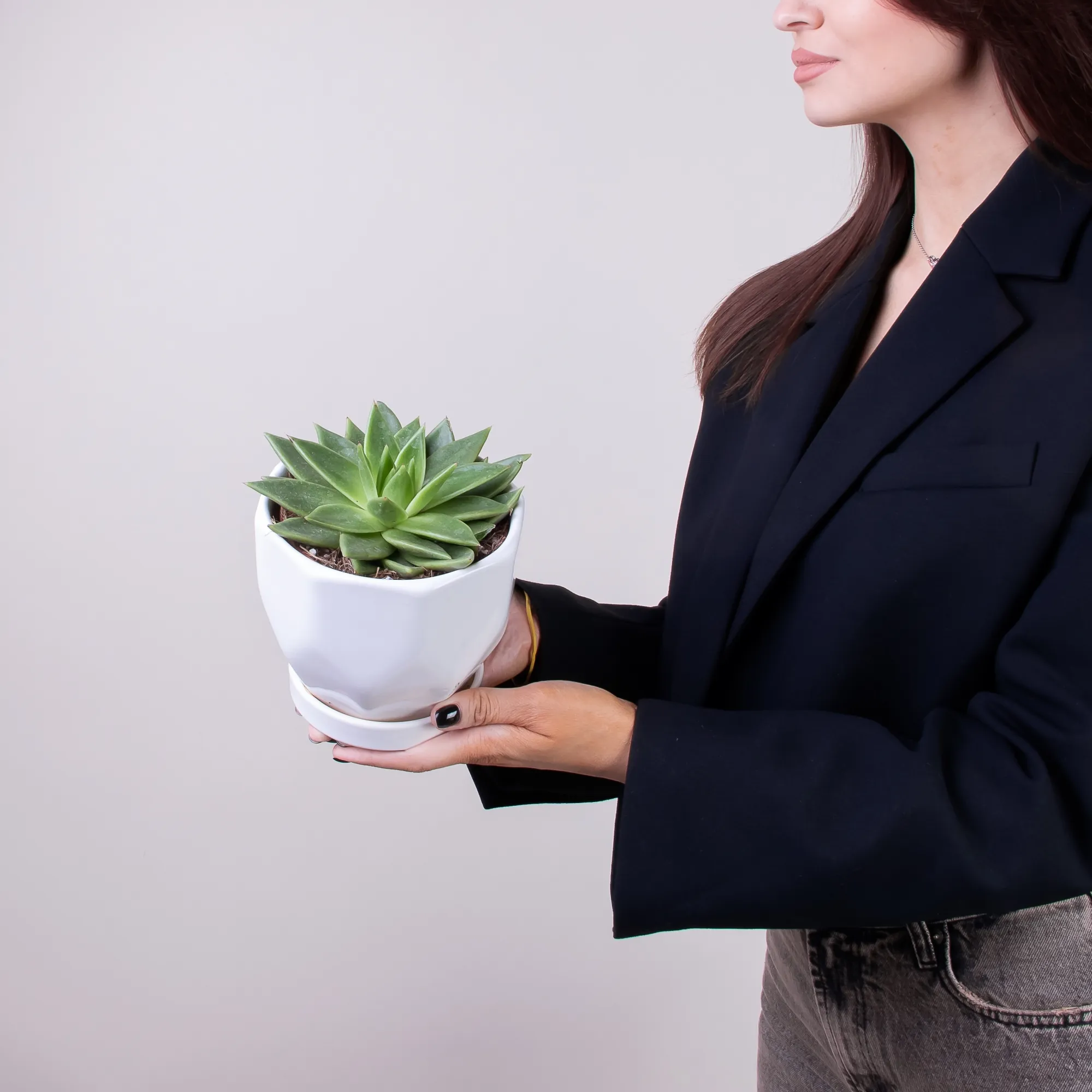 Как правило, растения доставляются в техническом пластиковом горшке от поставщика. Если в наименовании указано «в керамике/цинке», то в эту стоимость входит декоративное кашпо.