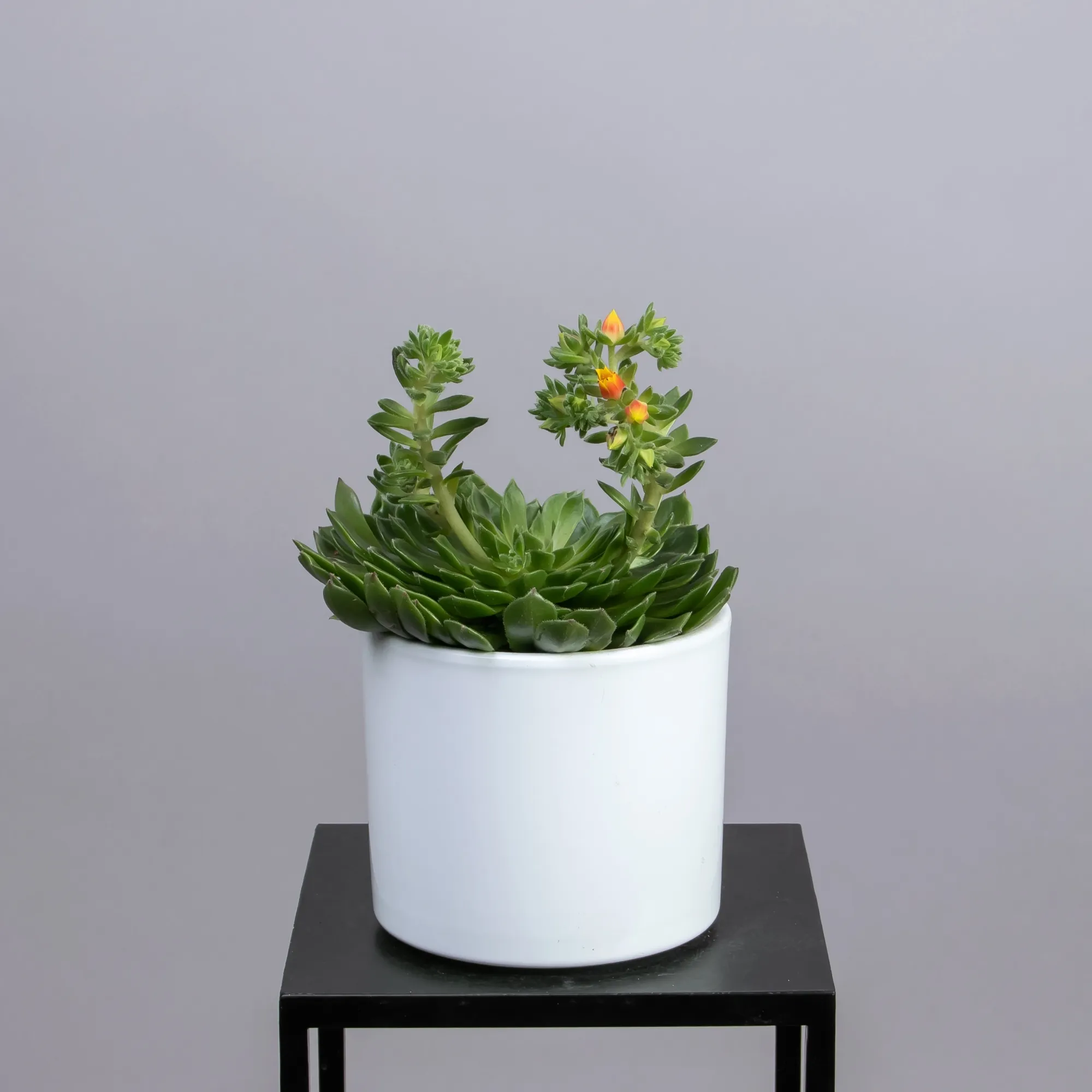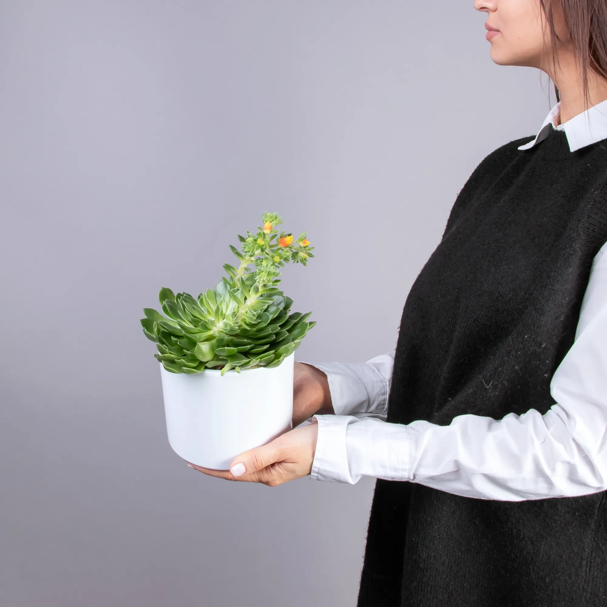 Как правило, растения доставляются в техническом пластиковом горшке от поставщика. Если в наименовании указано «в керамике/цинке», то в эту стоимость входит декоративное кашпо.