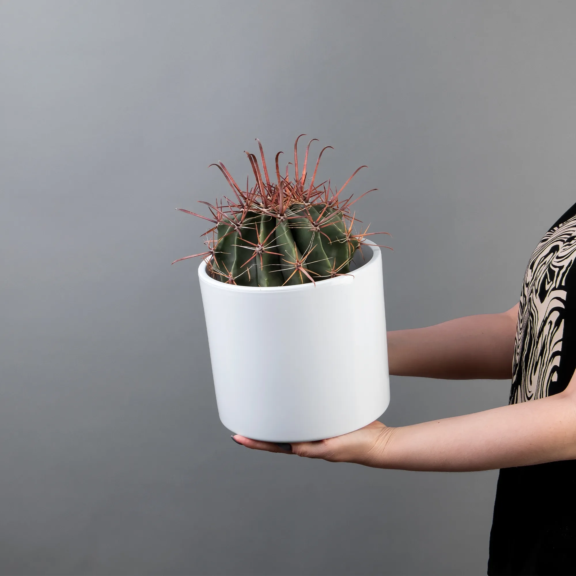 Как правило, растения доставляются в техническом пластиковом горшке от поставщика. Если в наименовании указано «в керамике/цинке», то в эту стоимость входит декоративное кашпо.