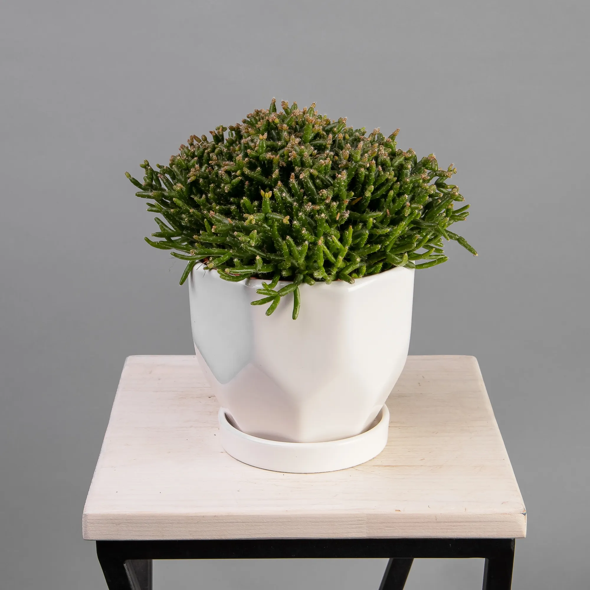 Как правило, растения доставляются в техническом пластиковом горшке от поставщика. Если в наименовании указано «в керамике/цинке», то в эту стоимость входит декоративное кашпо.