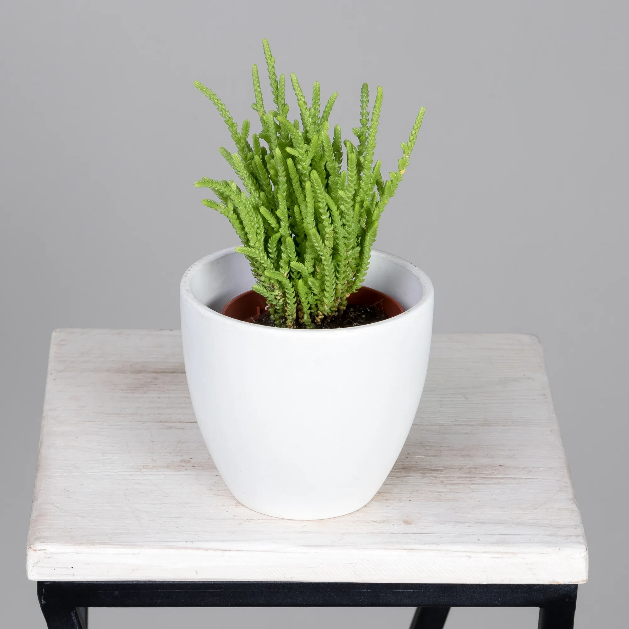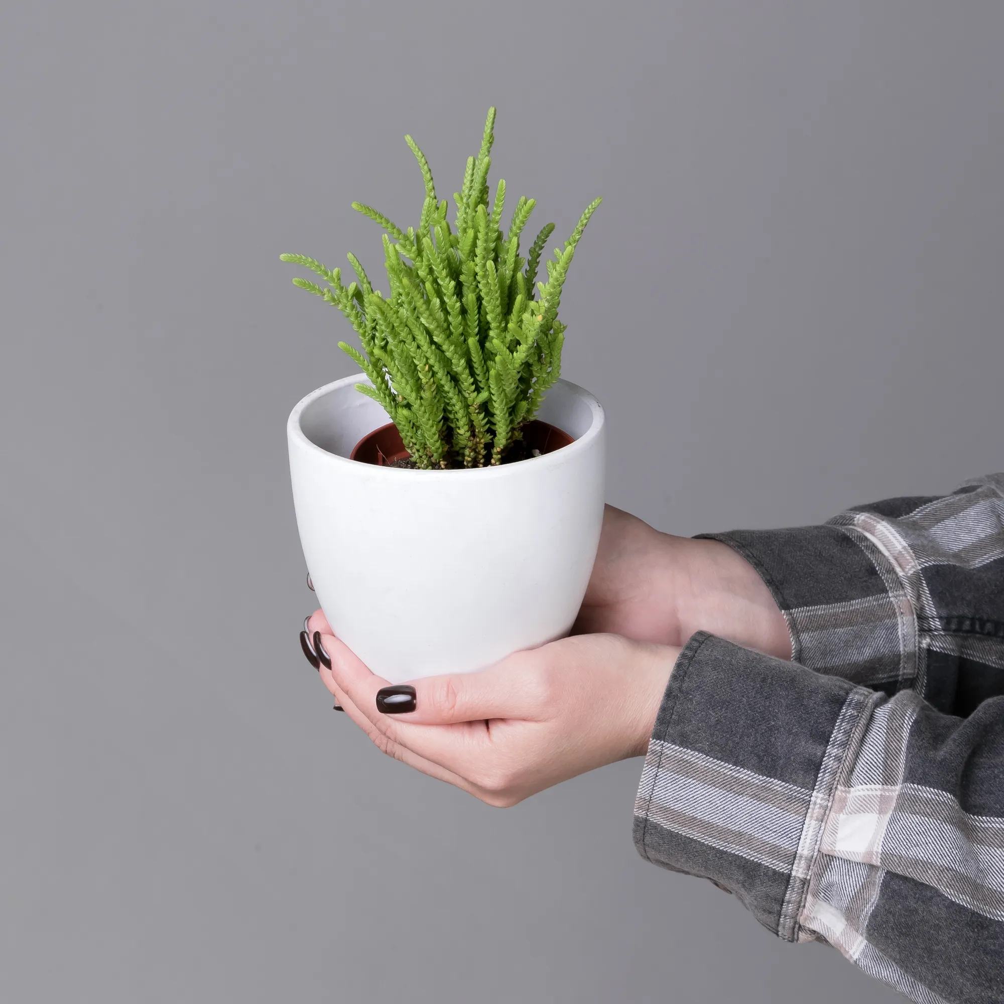Как правило, растения доставляются в техническом пластиковом горшке от поставщика. Если в наименовании указано «в керамике/цинке», то в эту стоимость входит декоративное кашпо.