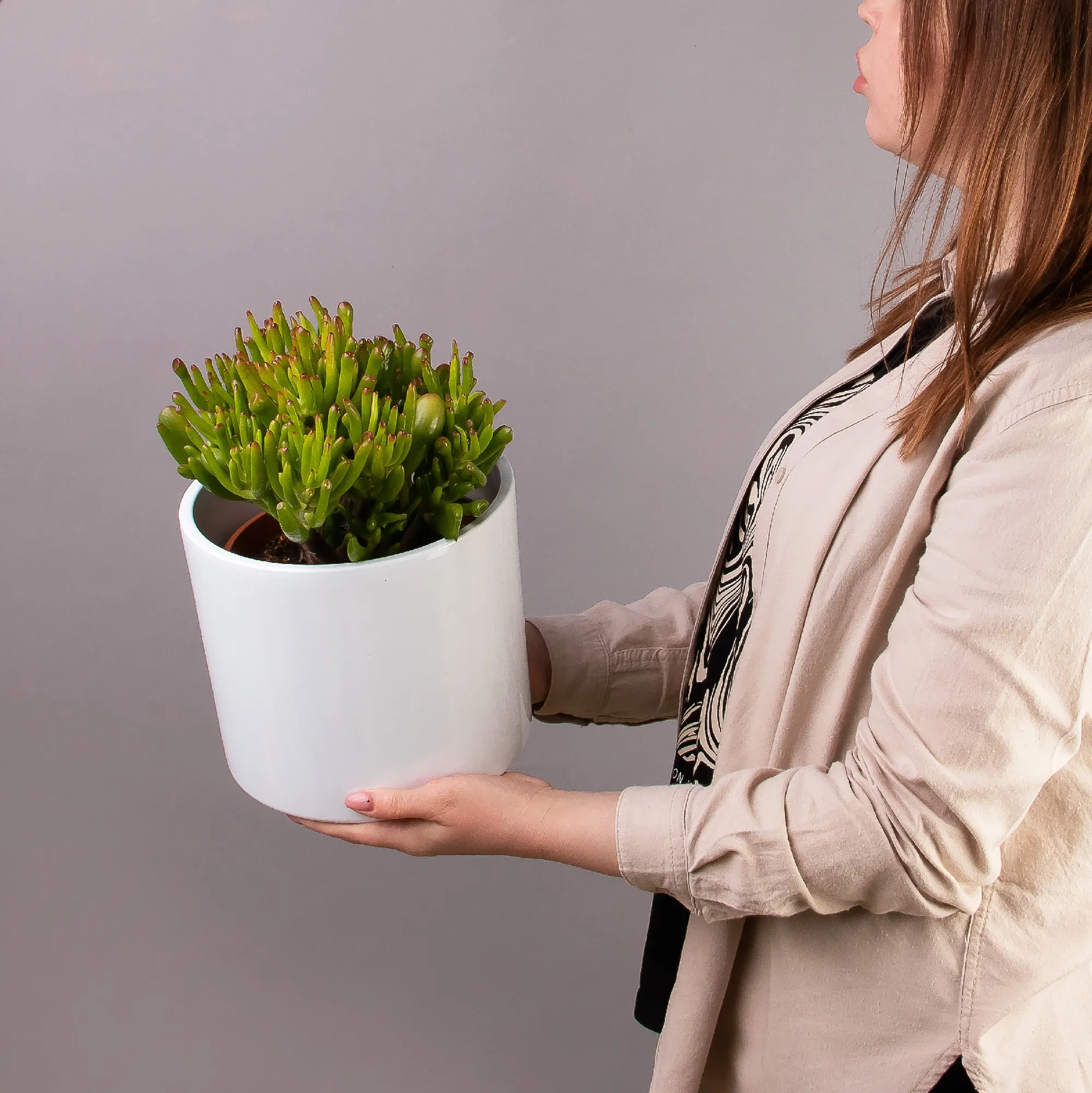 Как правило, растения доставляются в техническом пластиковом горшке от поставщика. Если в наименовании указано «в керамике/цинке», то в эту стоимость входит декоративное кашпо.