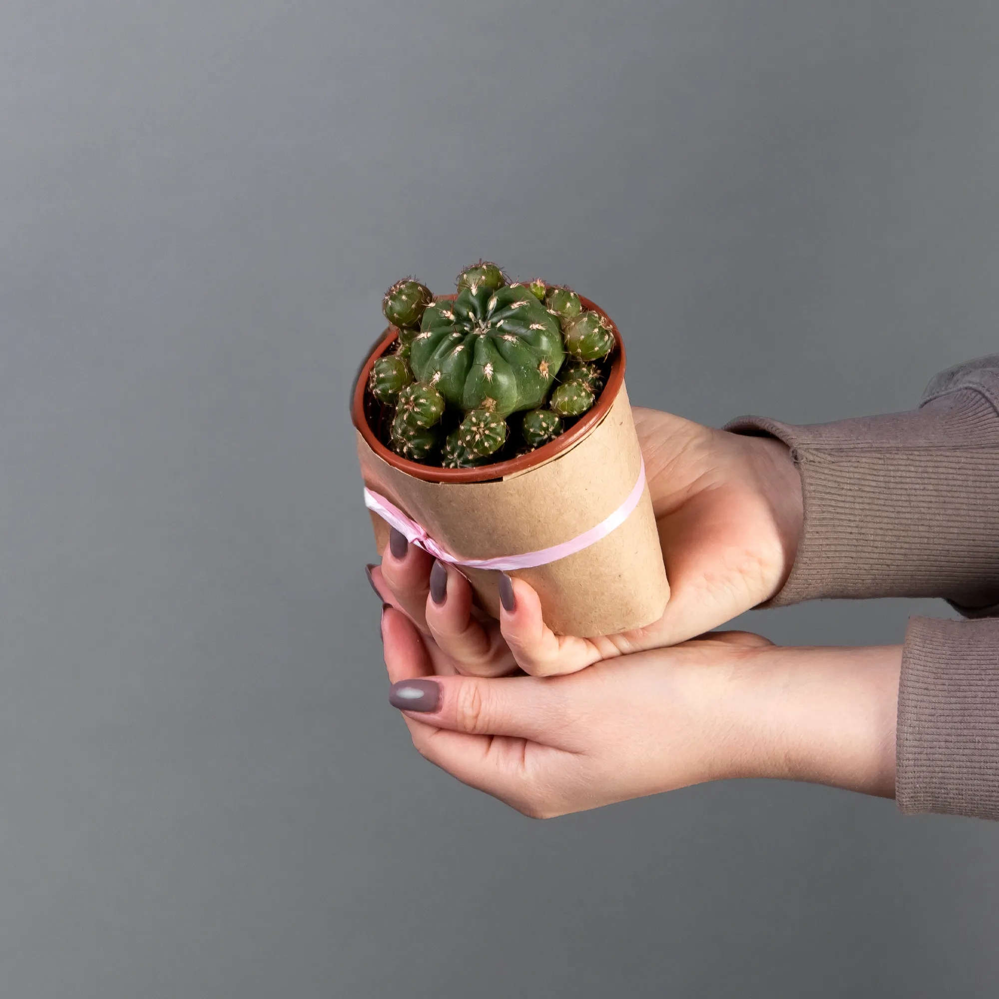 Как правило, растения доставляются в техническом пластиковом горшке от поставщика. Если в наименовании указано «в керамике/цинке», то в эту стоимость входит декоративное кашпо.