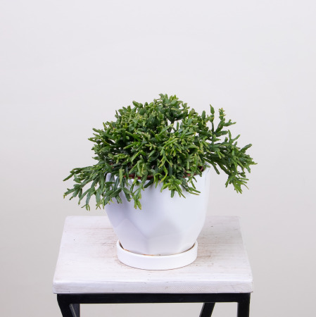 Как правило, растения доставляются в техническом пластиковом горшке от поставщика. Если в наименовании указано «в керамике/цинке», то в эту стоимость входит декоративное кашпо.