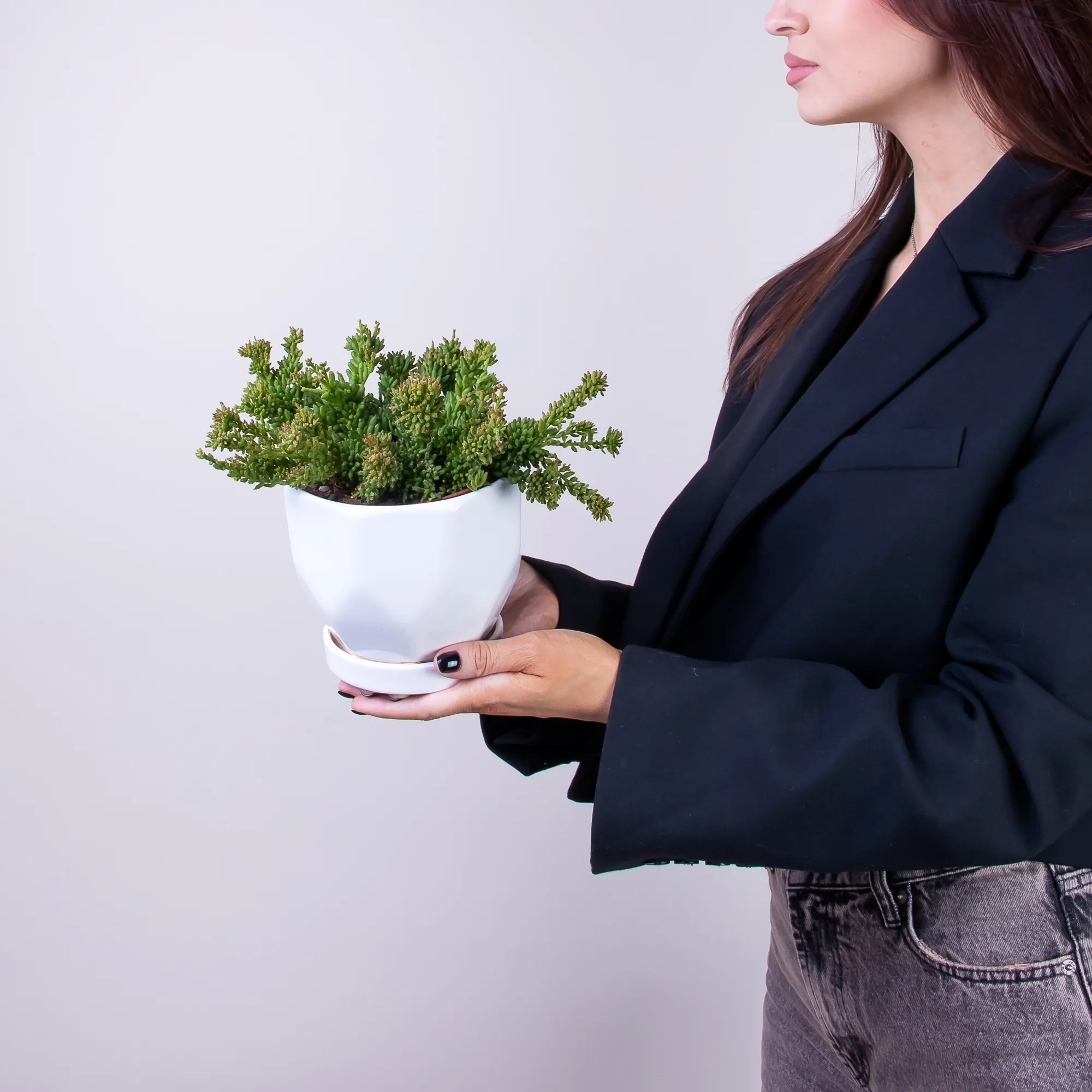 Как правило, растения доставляются в техническом пластиковом горшке от поставщика. Если в наименовании указано «в керамике/цинке», то в эту стоимость входит декоративное кашпо.