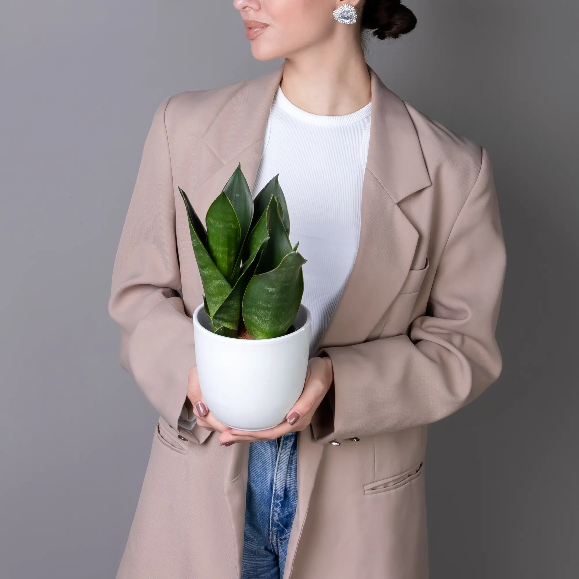 Как правило, растения доставляются в техническом пластиковом горшке от поставщика. Если в наименовании указано «в керамике/цинке», то в эту стоимость входит декоративное кашпо.