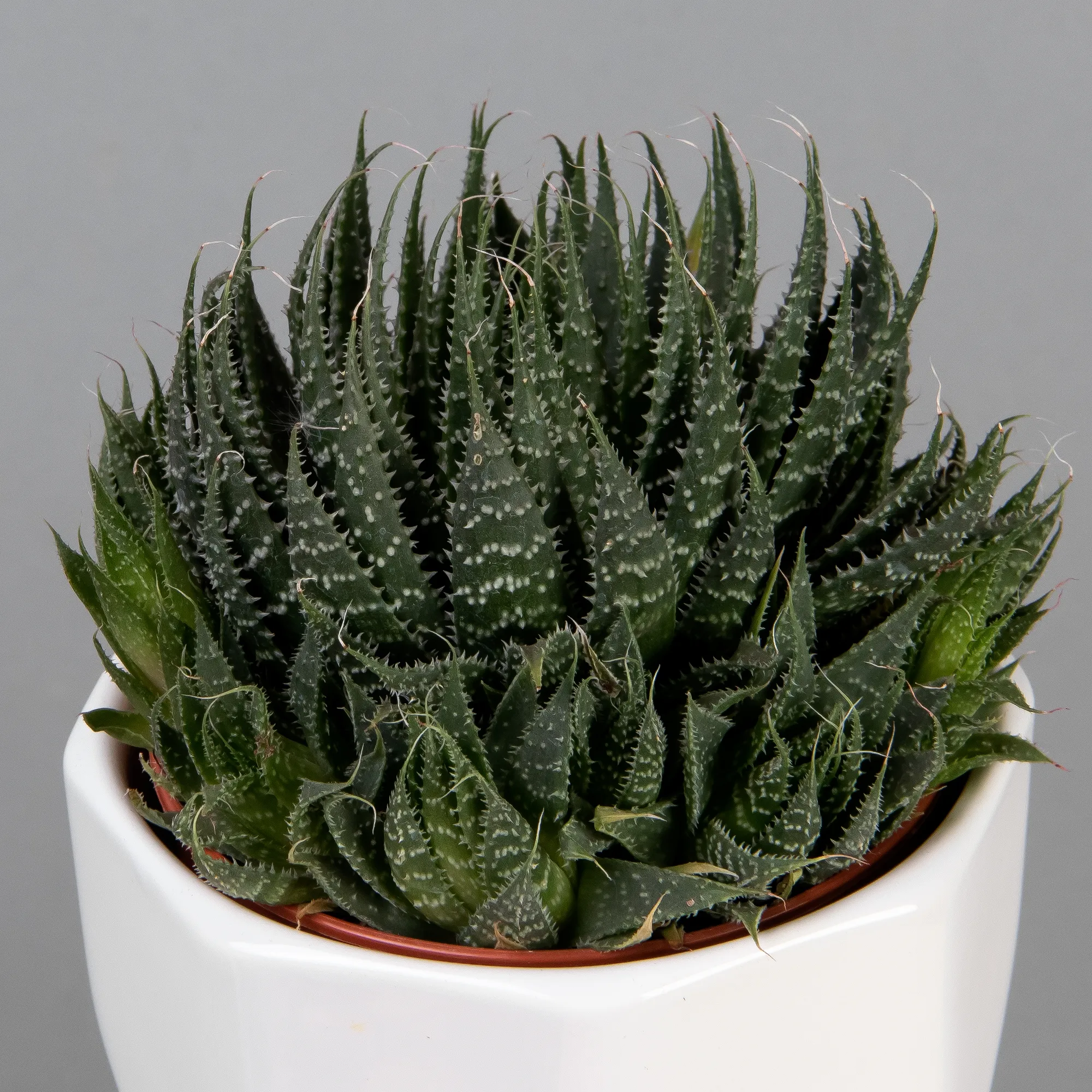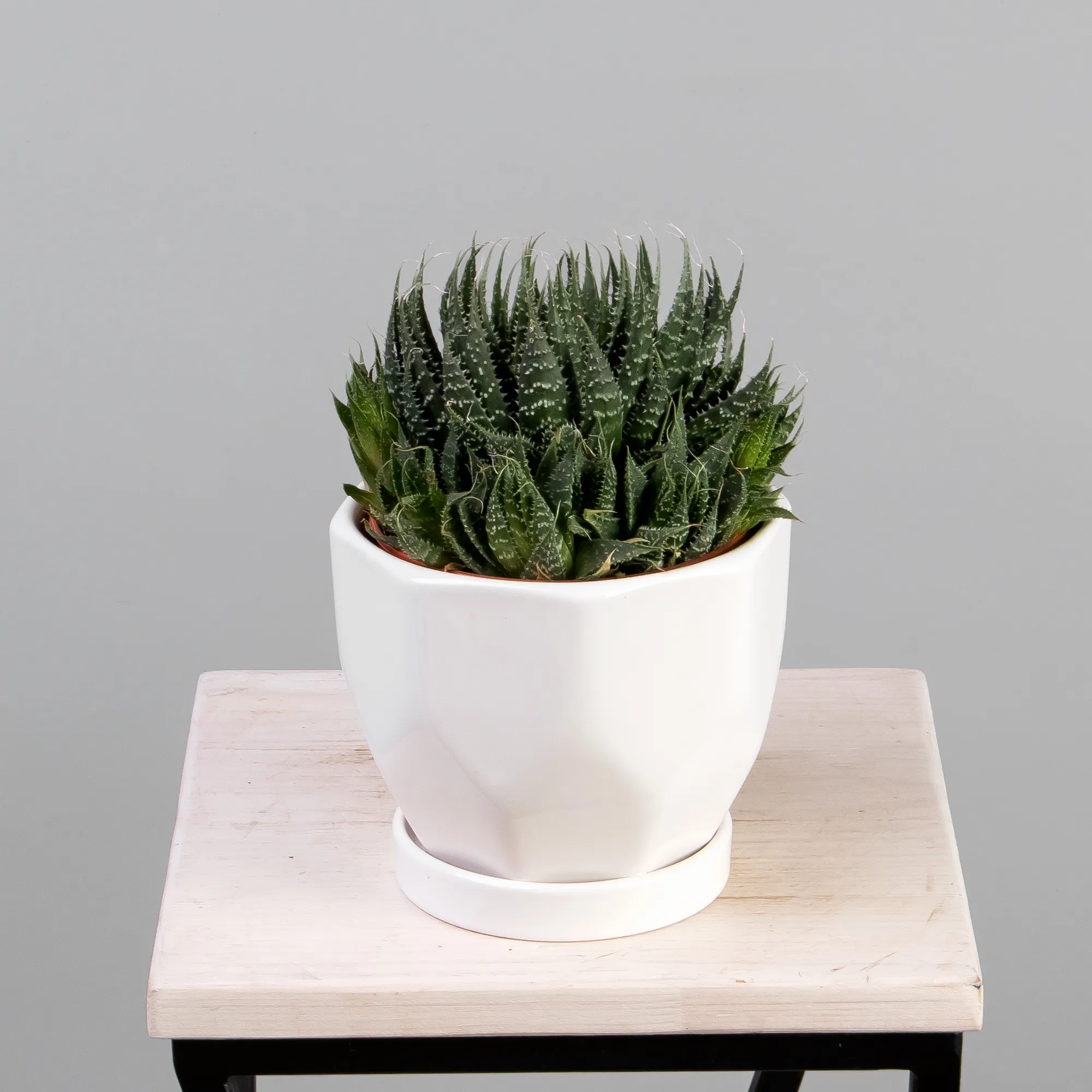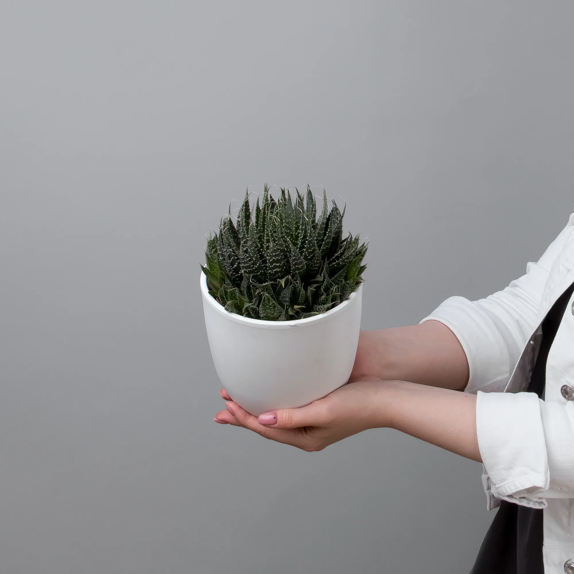Как правило, растения доставляются в техническом пластиковом горшке от поставщика. Если в наименовании указано «в керамике/цинке», то в эту стоимость входит декоративное кашпо.