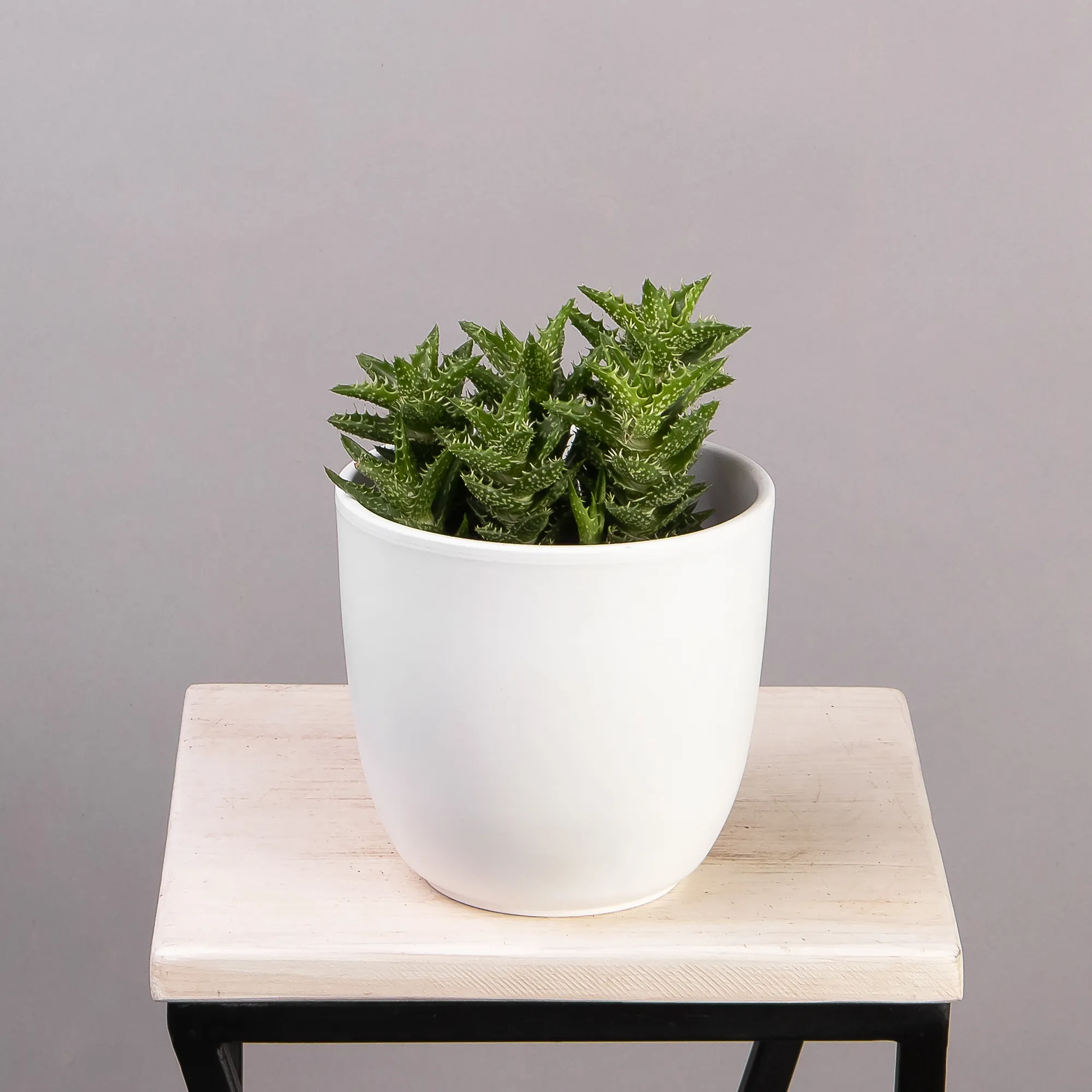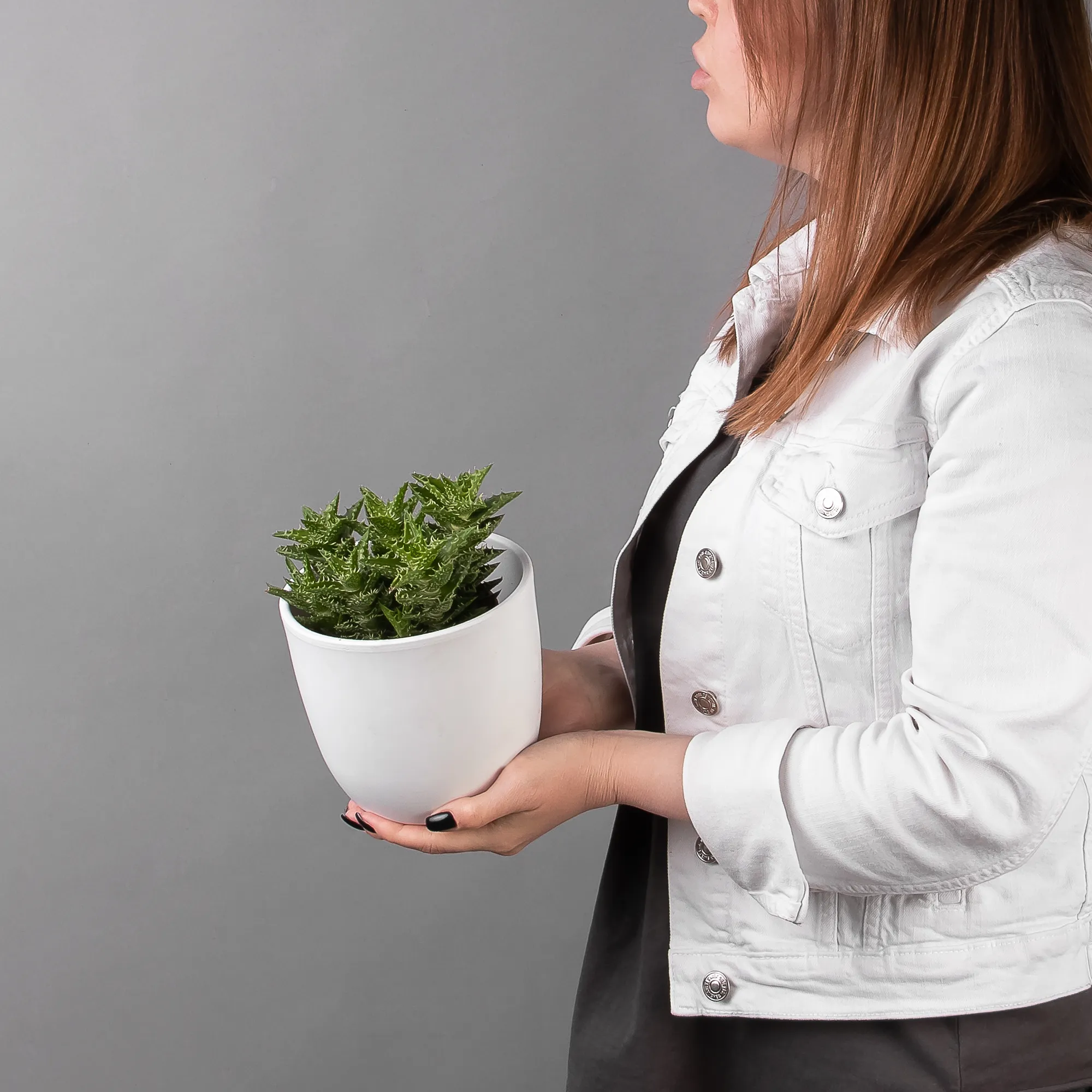 Как правило, растения доставляются в техническом пластиковом горшке от поставщика. Если в наименовании указано «в керамике/цинке», то в эту стоимость входит декоративное кашпо.