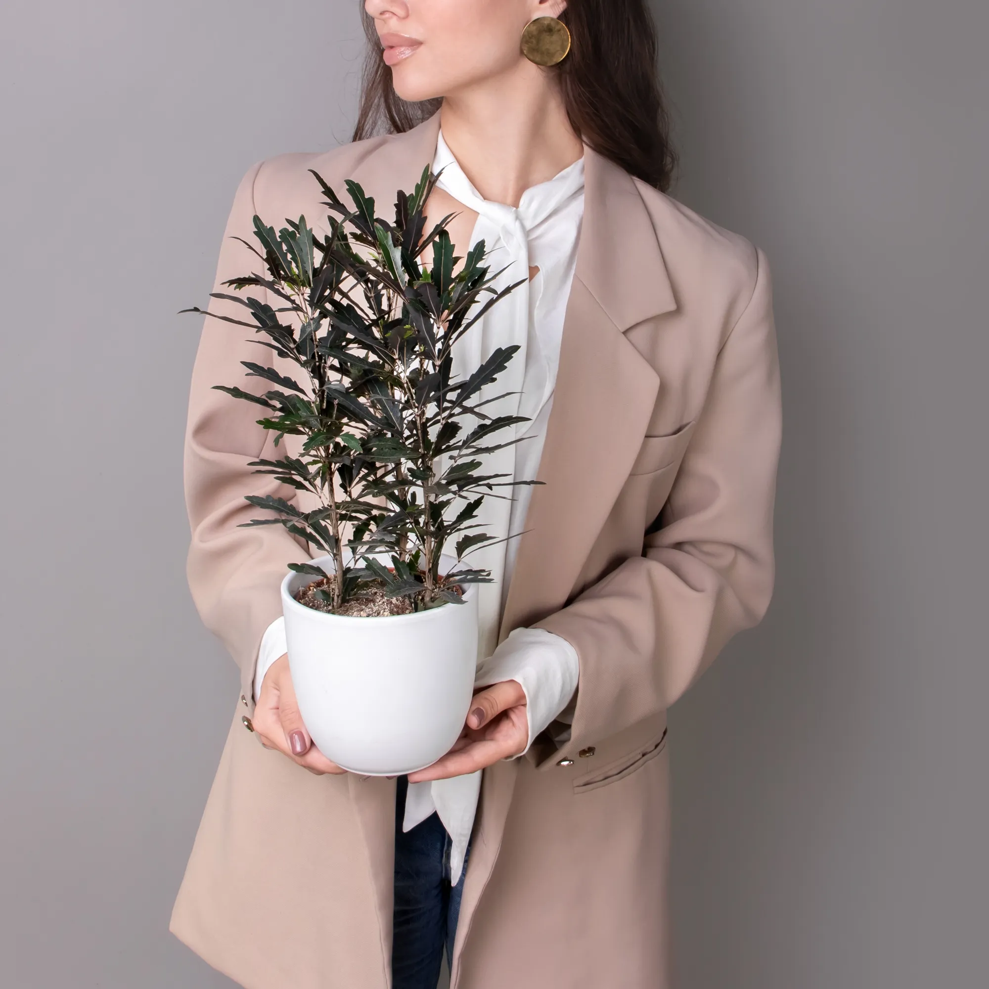 Как правило, растения доставляются в техническом пластиковом горшке от поставщика. Если в наименовании указано «в керамике/цинке», то в эту стоимость входит декоративное кашпо.