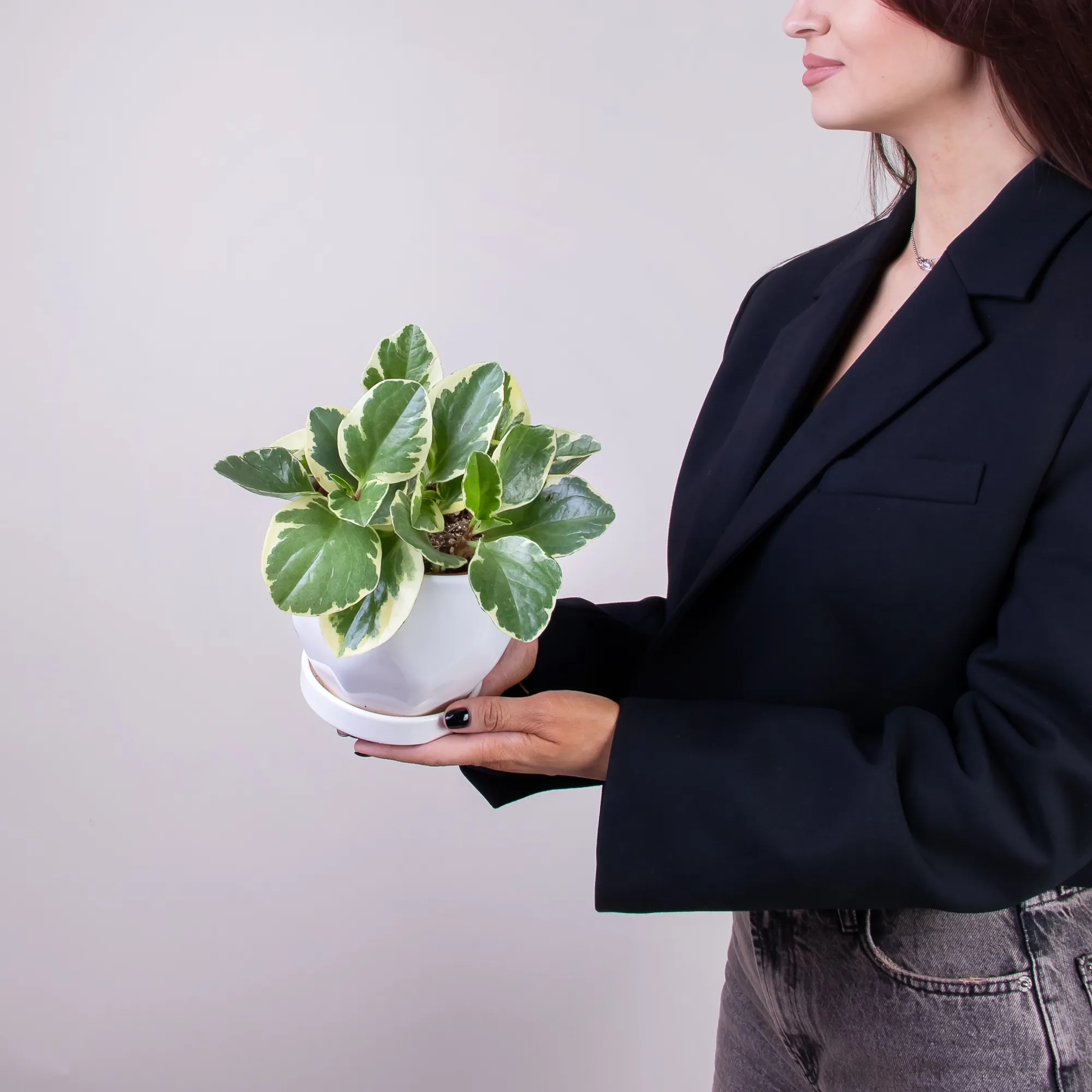 Как правило, растения доставляются в техническом пластиковом горшке от поставщика. Если в наименовании указано «в керамике/цинке», то в эту стоимость входит декоративное кашпо.
