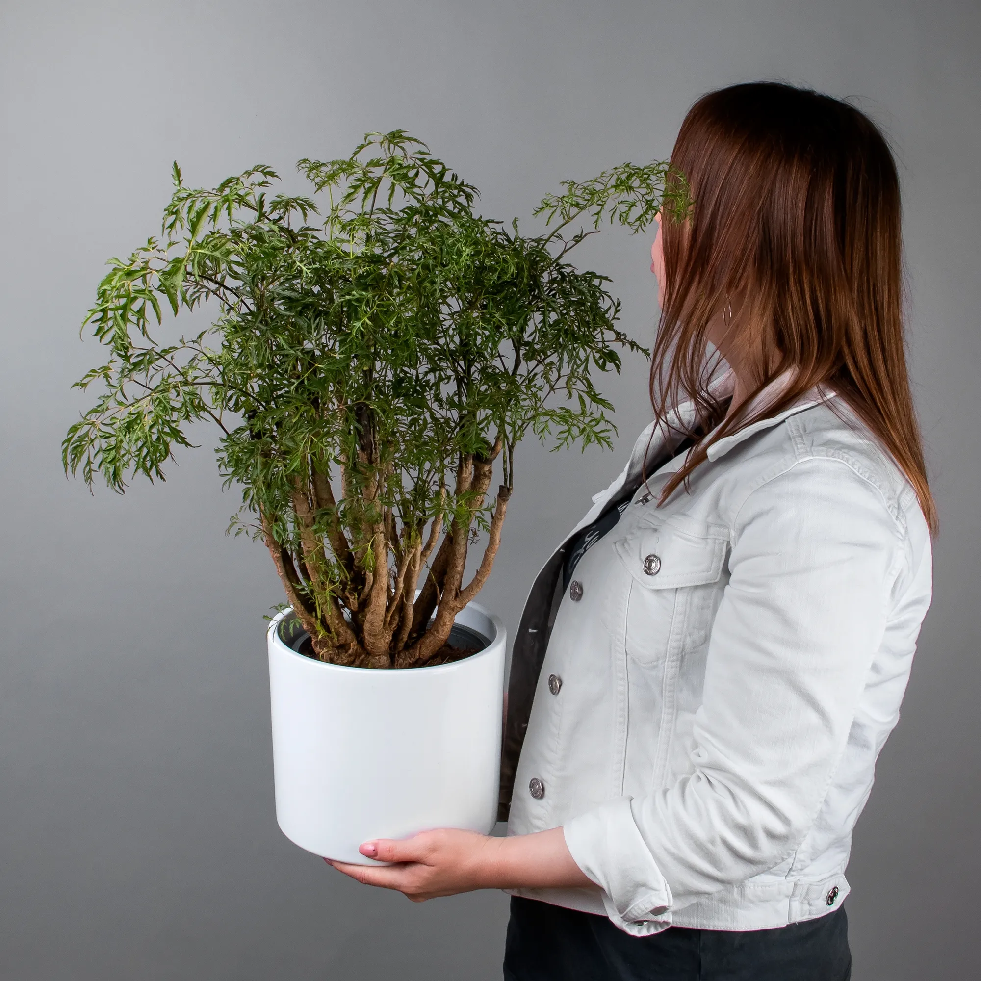 Как правило, растения доставляются в техническом пластиковом горшке от поставщика. Если в наименовании указано «в керамике/цинке», то в эту стоимость входит декоративное кашпо.