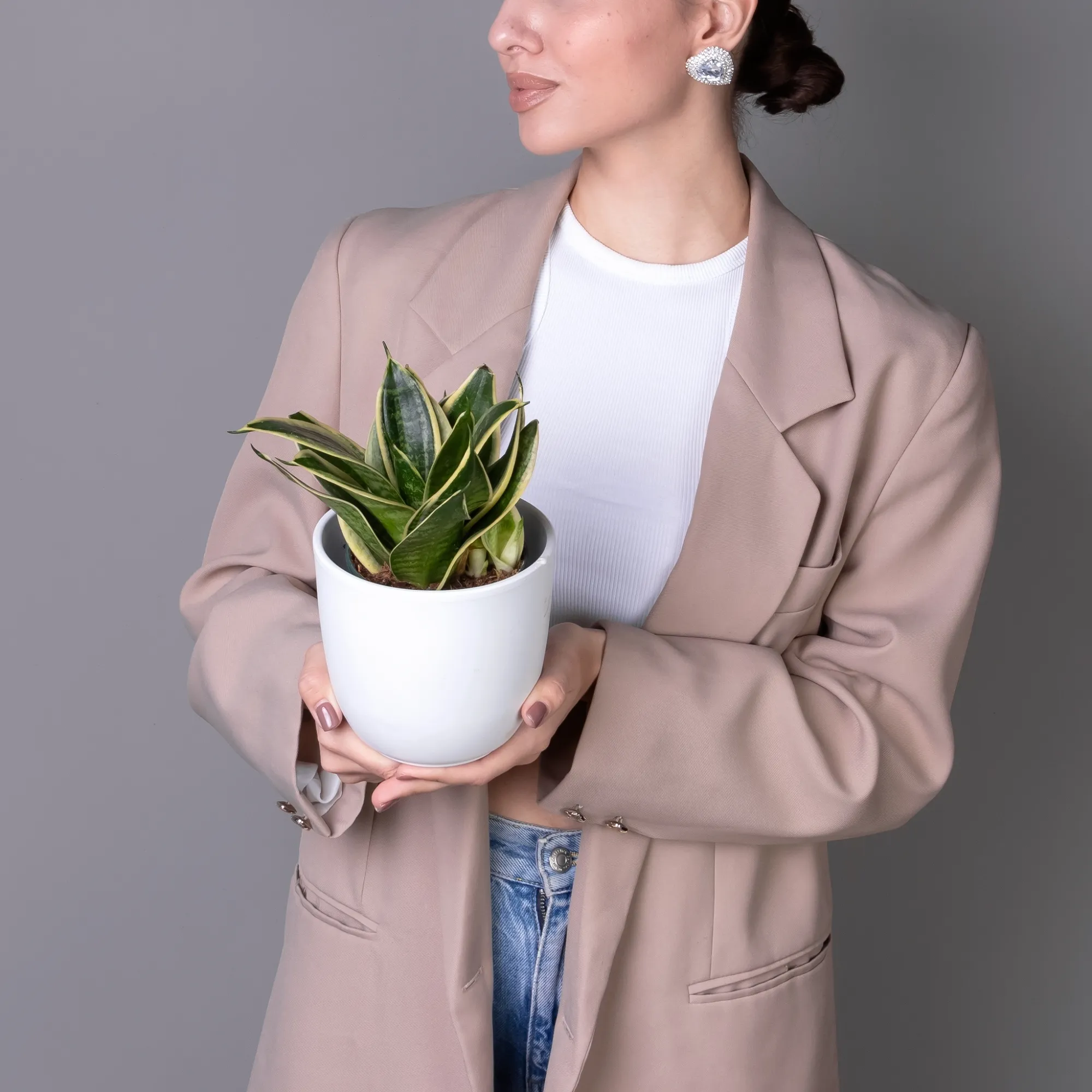 Как правило, растения доставляются в техническом пластиковом горшке от поставщика. Если в наименовании указано «в керамике/цинке», то в эту стоимость входит декоративное кашпо.
