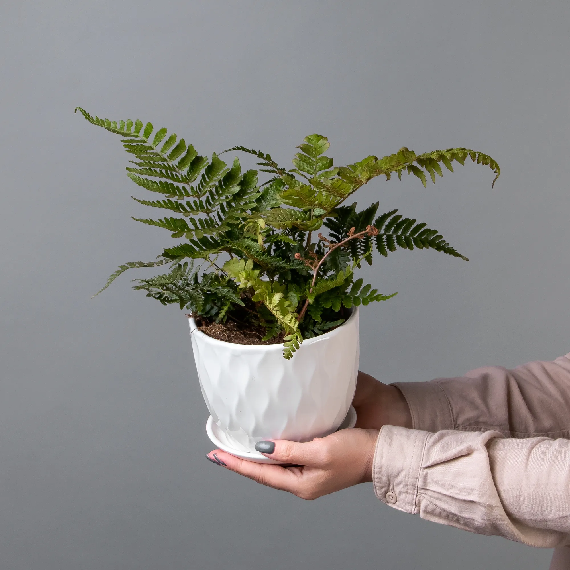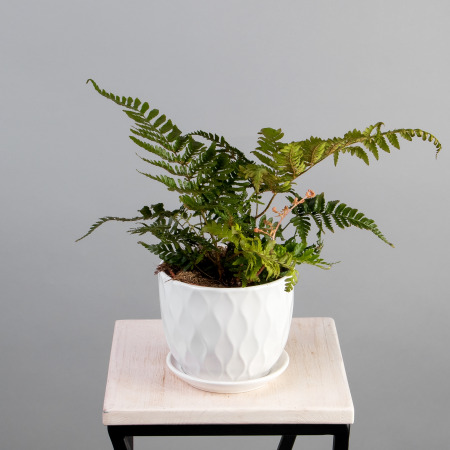 Как правило, растения доставляются в техническом пластиковом горшке от поставщика. Если в наименовании указано «в керамике/цинке», то в эту стоимость входит декоративное кашпо.