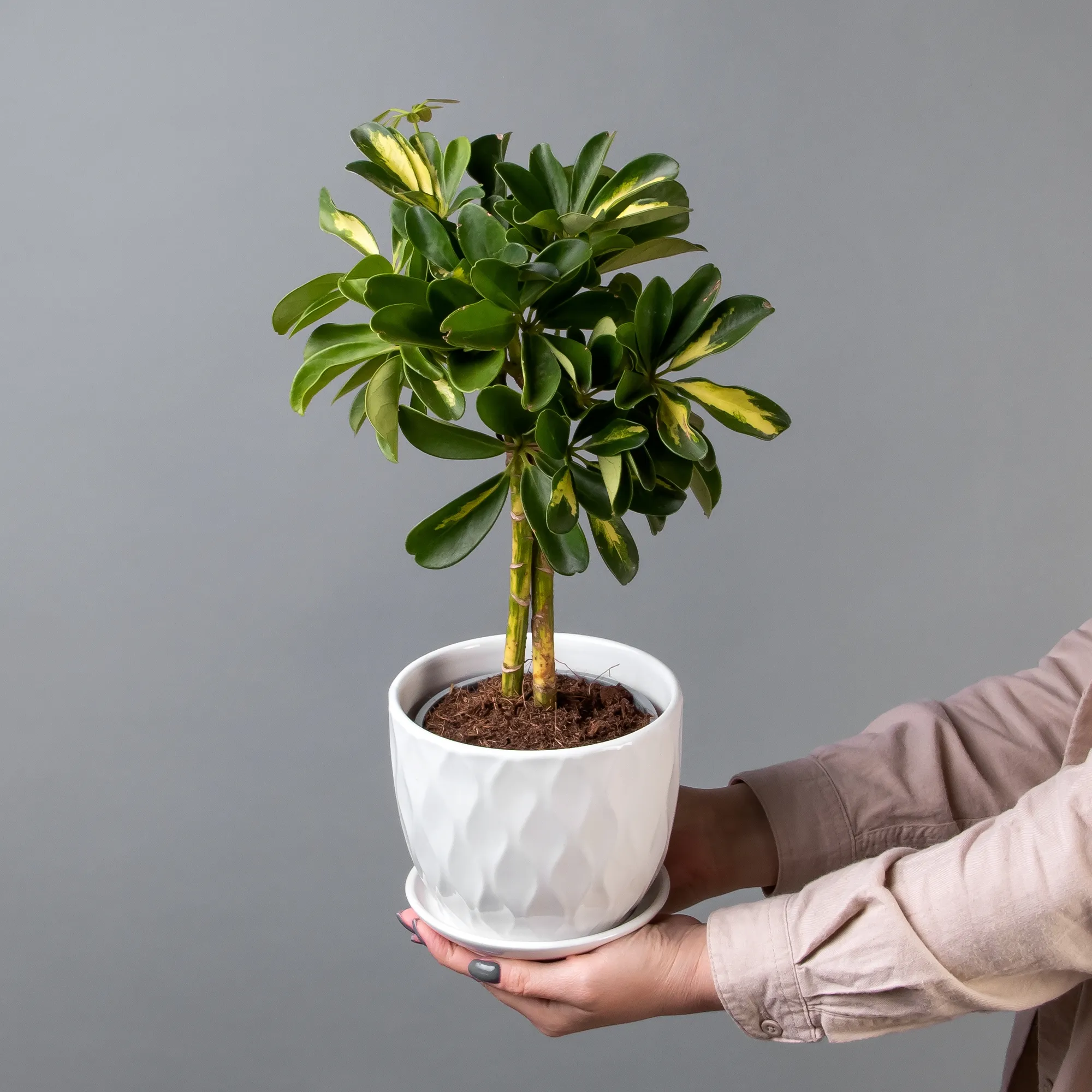 Как правило, растения доставляются в техническом пластиковом горшке от поставщика. Если в наименовании указано «в керамике/цинке», то в эту стоимость входит декоративное кашпо.