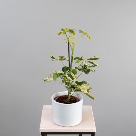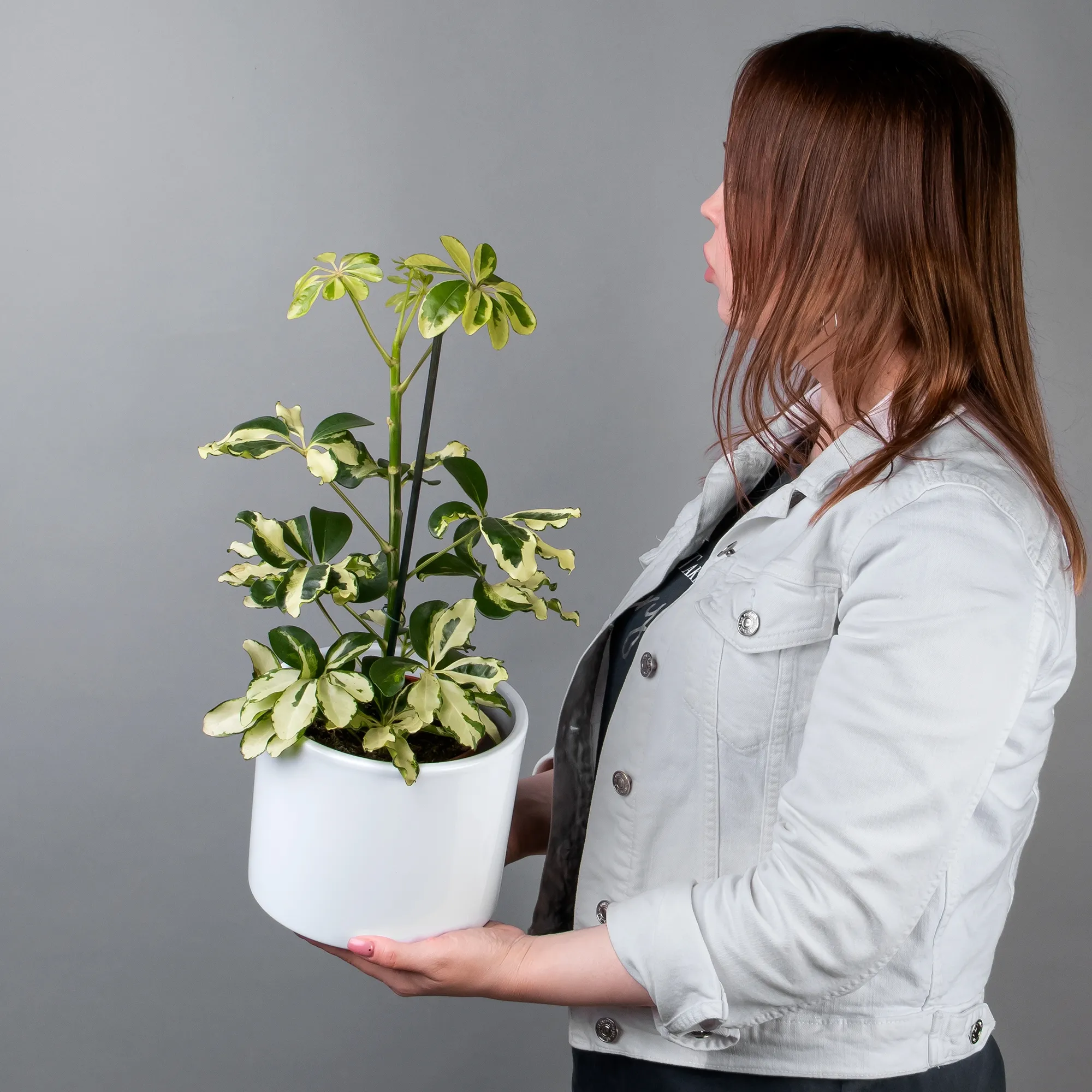 Как правило, растения доставляются в техническом пластиковом горшке от поставщика. Если в наименовании указано «в керамике/цинке», то в эту стоимость входит декоративное кашпо.