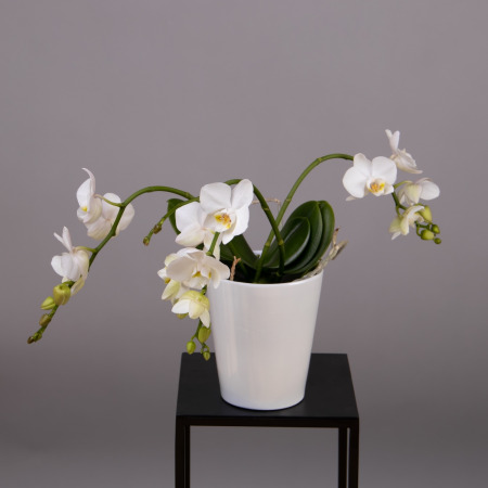 Как правило, растения доставляются в техническом пластиковом горшке от поставщика. Если в наименовании указано «в керамике/цинке», то в эту стоимость входит декоративное кашпо.