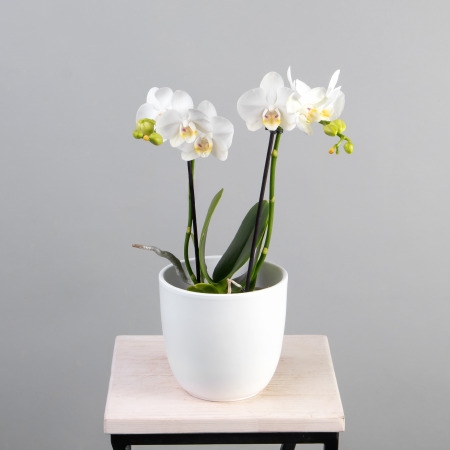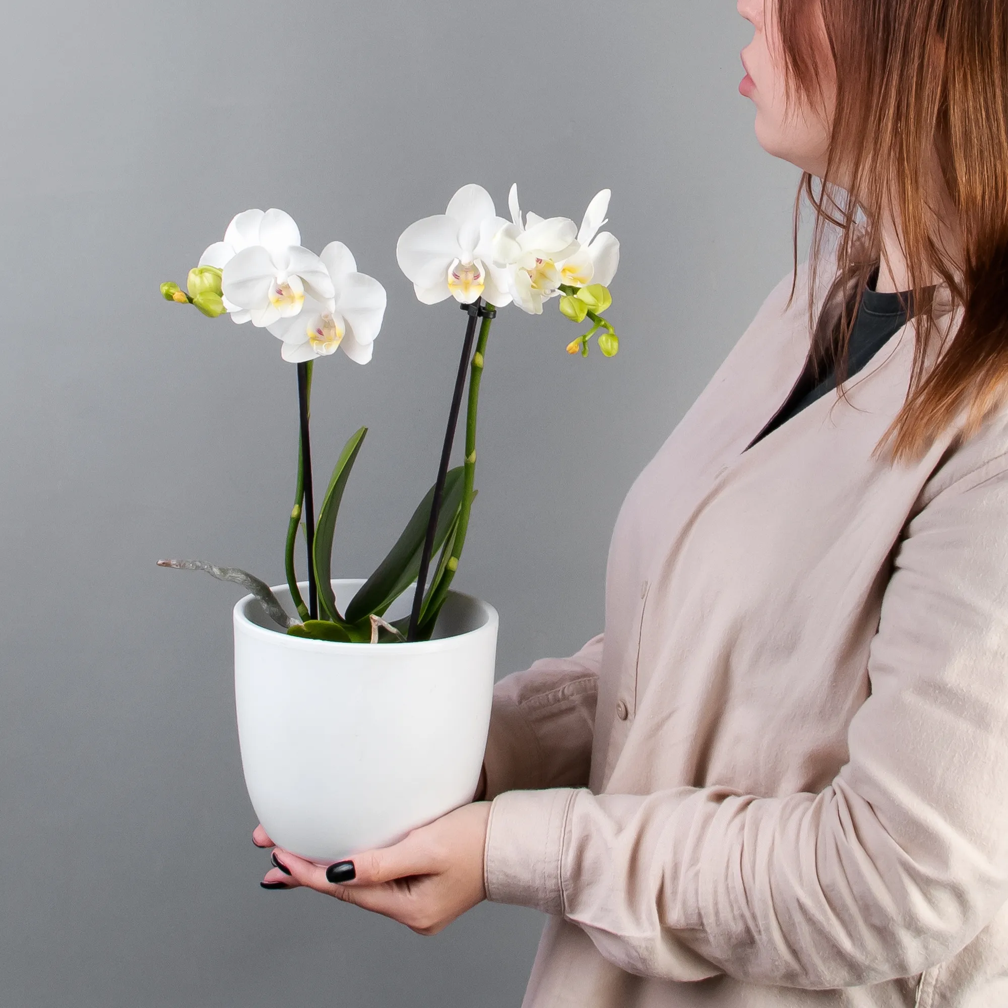Как правило, растения доставляются в техническом пластиковом горшке от поставщика. Если в наименовании указано «в керамике/цинке», то в эту стоимость входит декоративное кашпо.
