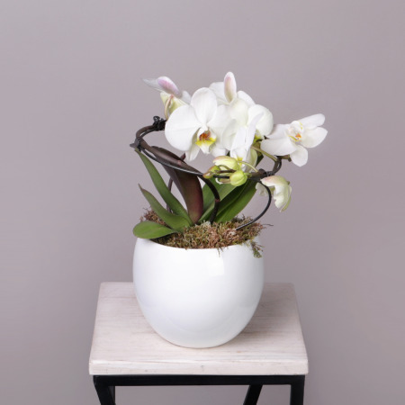 Как правило, растения доставляются в техническом пластиковом горшке от поставщика. Если в наименовании указано «в керамике/цинке», то в эту стоимость входит декоративное кашпо.