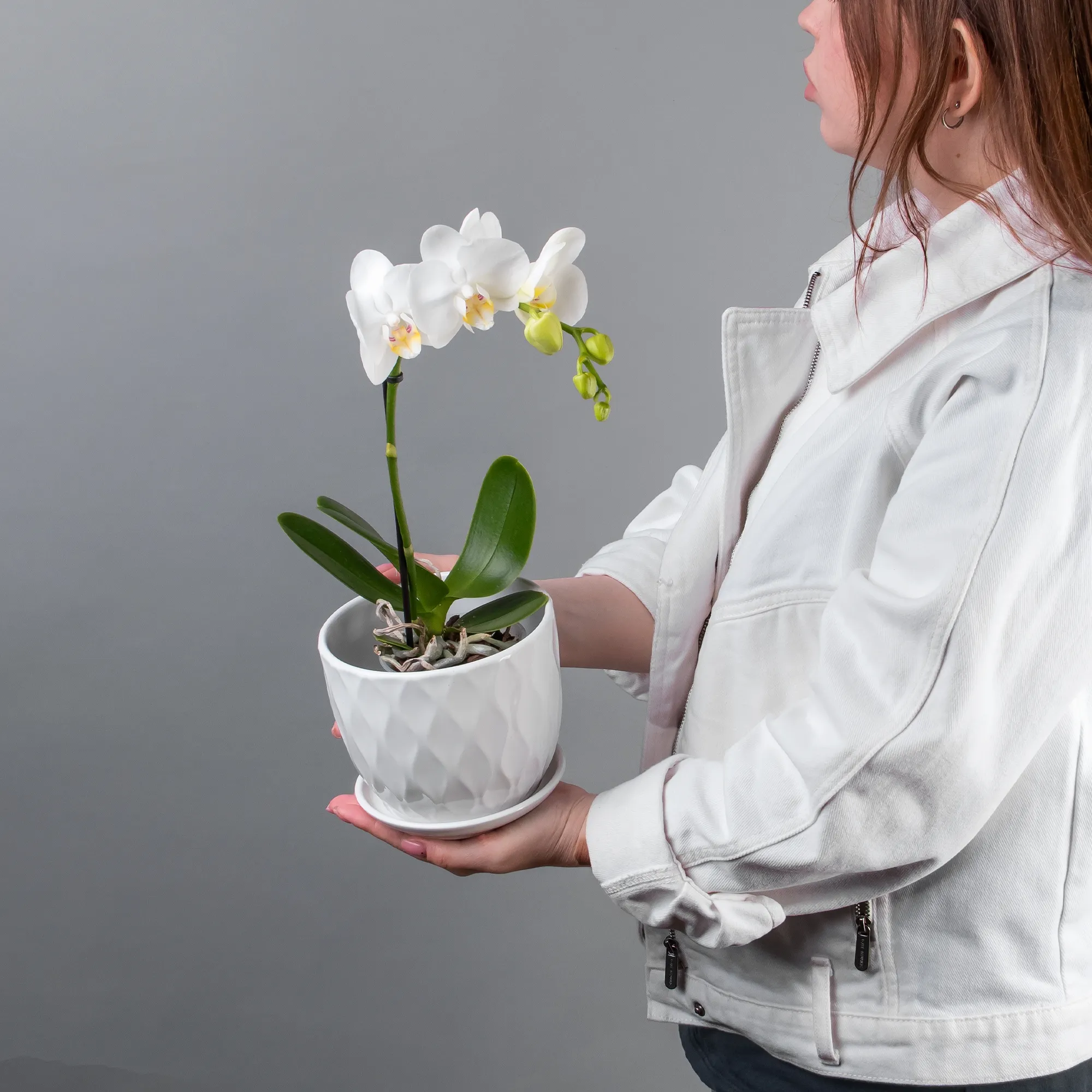 Как правило, растения доставляются в техническом пластиковом горшке от поставщика. Если в наименовании указано «в керамике/цинке», то в эту стоимость входит декоративное кашпо.