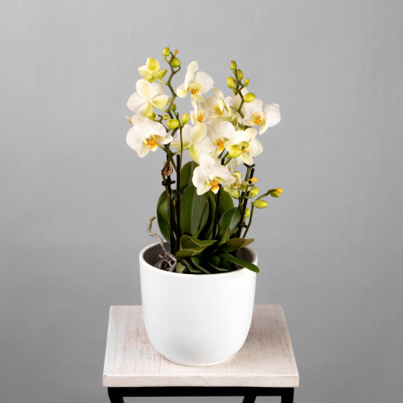 Как правило, растения доставляются в техническом пластиковом горшке от поставщика. Если в наименовании указано «в керамике/цинке», то в эту стоимость входит декоративное кашпо.