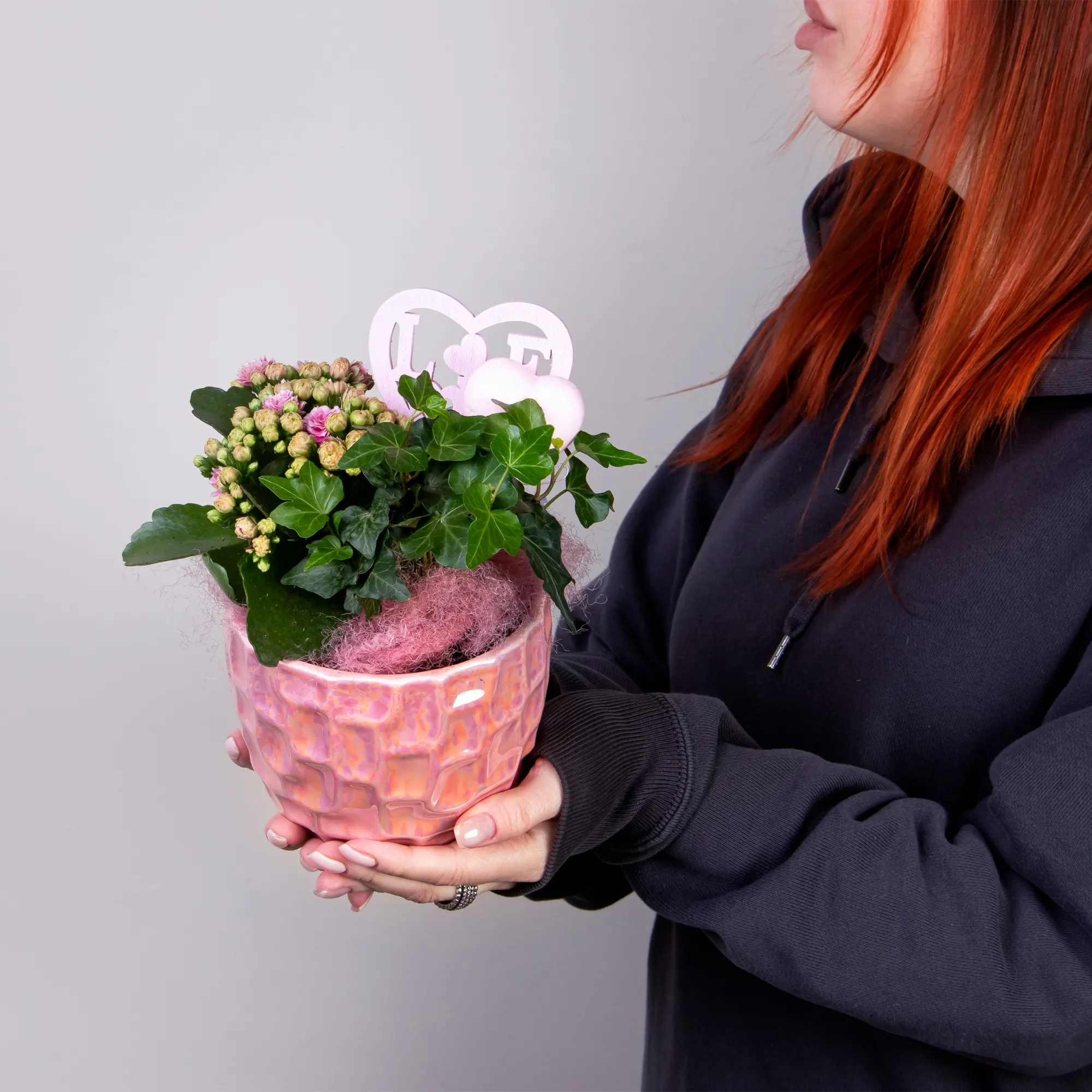Как правило, растения доставляются в техническом пластиковом горшке от поставщика. Если в наименовании указано «в керамике/цинке», то в эту стоимость входит декоративное кашпо.