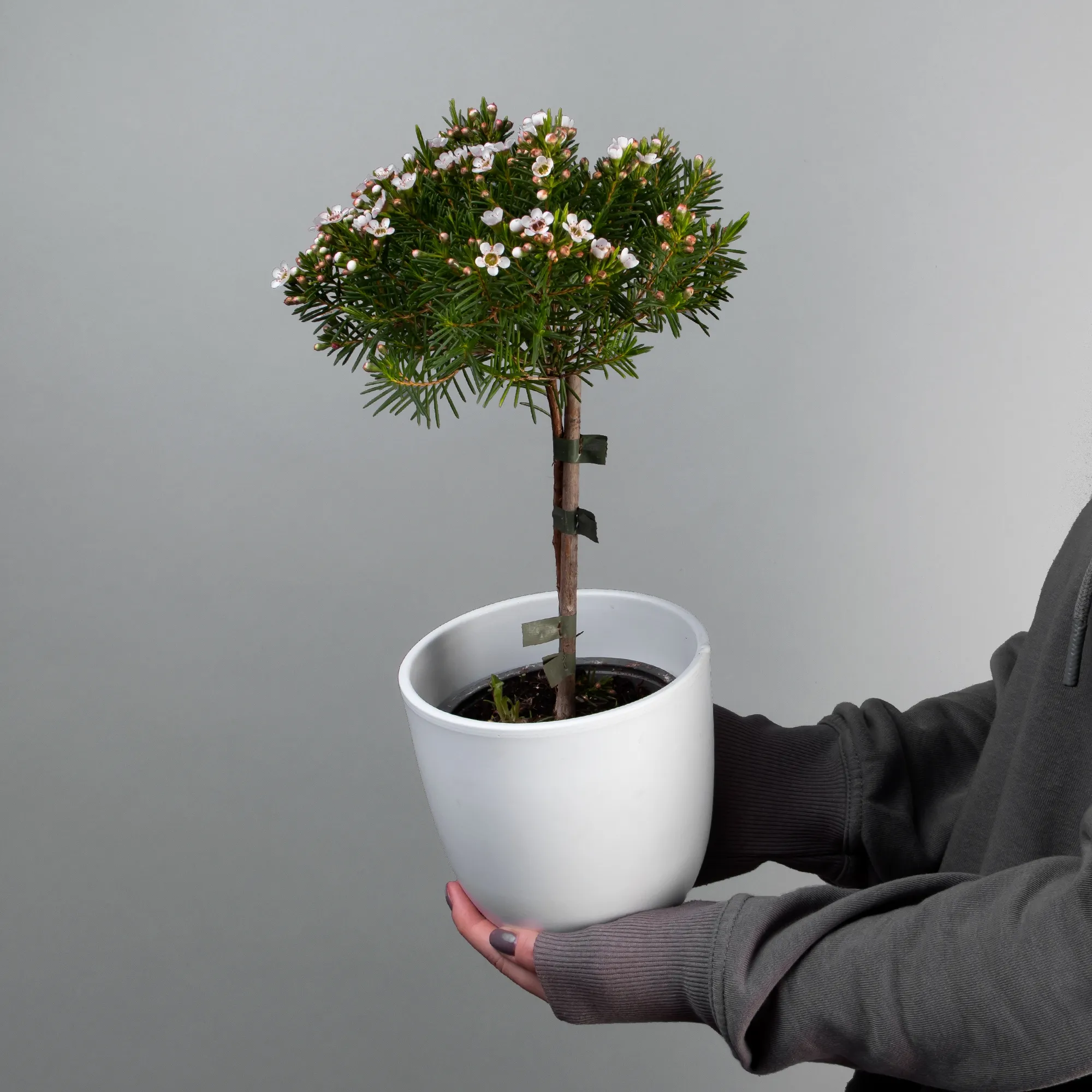 Как правило, растения доставляются в техническом пластиковом горшке от поставщика. Если в наименовании указано «в керамике/цинке», то в эту стоимость входит декоративное кашпо.