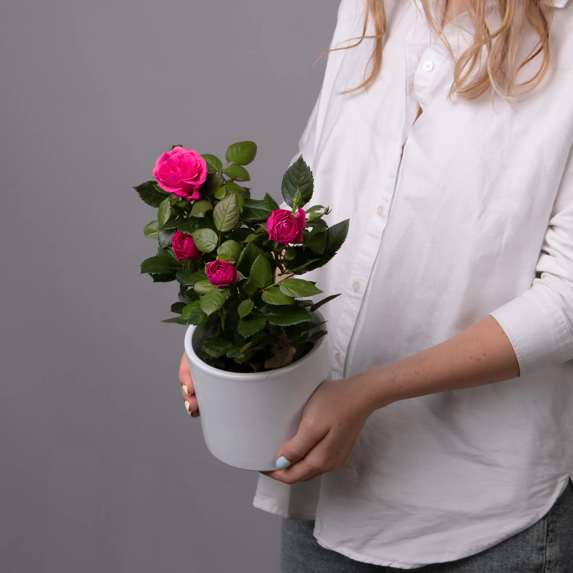 Как правило, растения доставляются в техническом пластиковом горшке от поставщика. Если в наименовании указано «в керамике/цинке», то в эту стоимость входит декоративное кашпо.