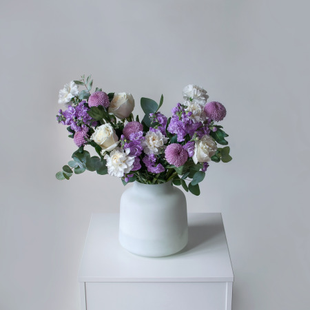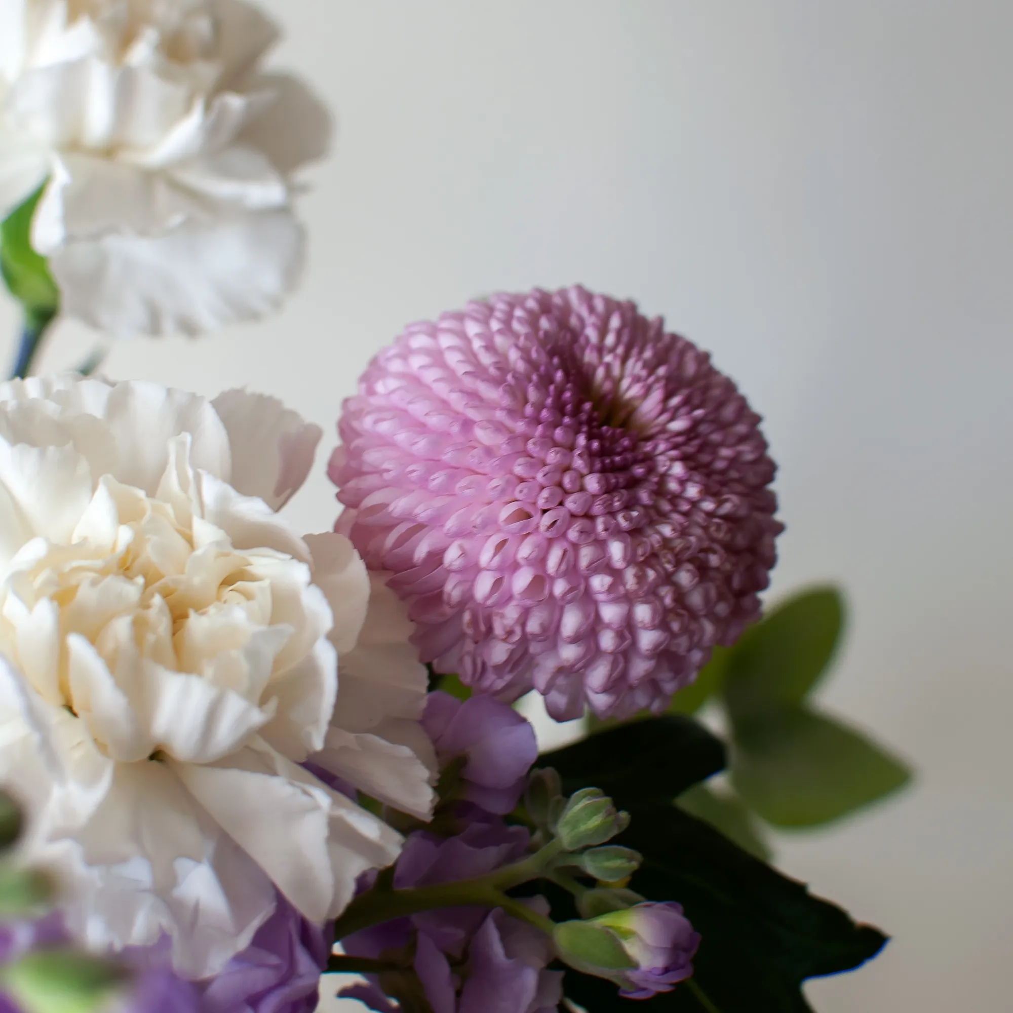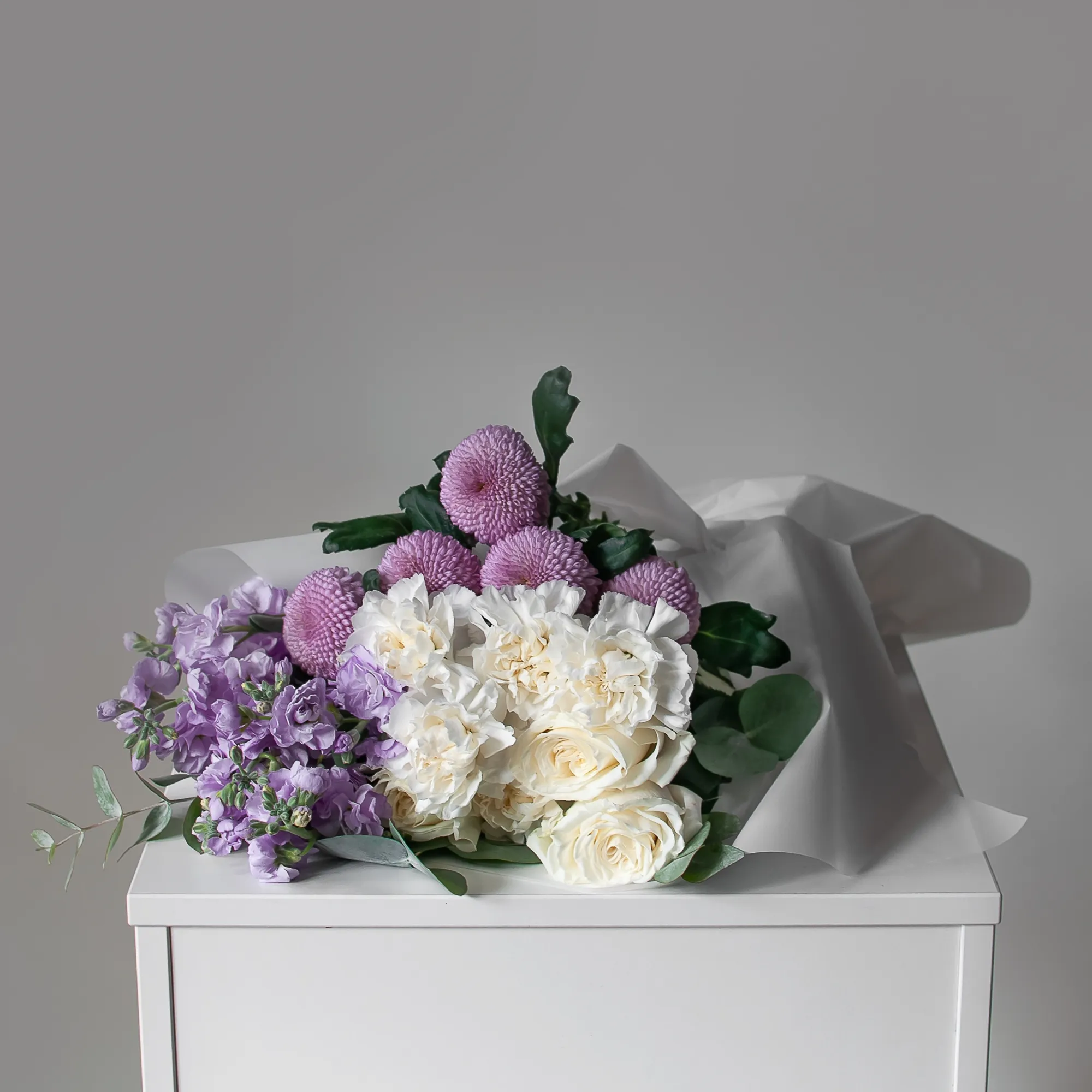 В букете №2 гармонично сочетаются текстурные хризантемы сорта "Момоко", ароматная кустовая маттиола, белые розы и белые гвоздики. Дополнен букет листьями эвкалипта. Вы сможете почувствовать себя в роли флориста и самостоятельно собрать букет как на фотографии. Или подарить эту возможность тому, кто давно мечтал сделать букет своими руками. В набор также входит флористический нож, инструкция по обработке цветов, конверт с открыткой и средство для продления жизни цветов.
