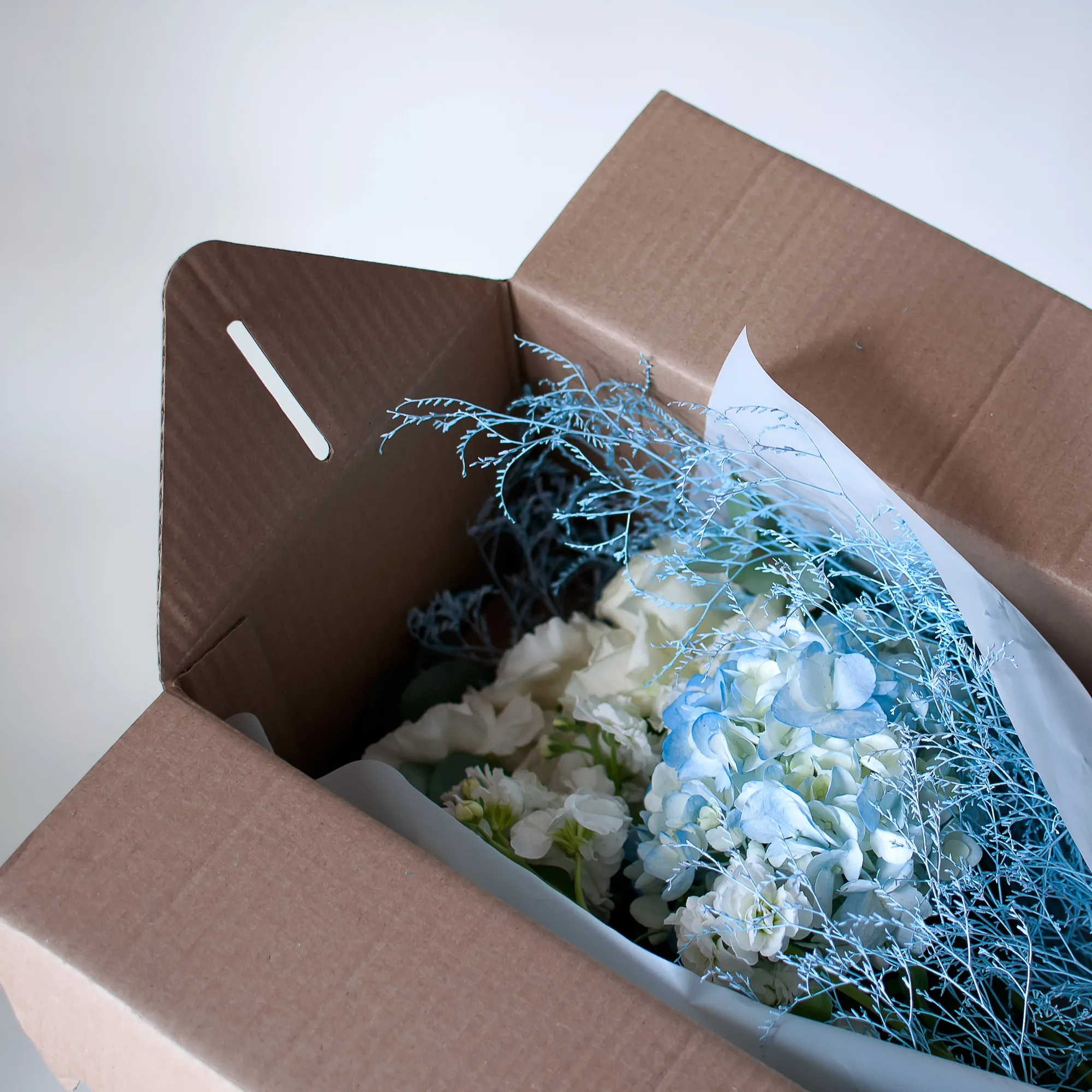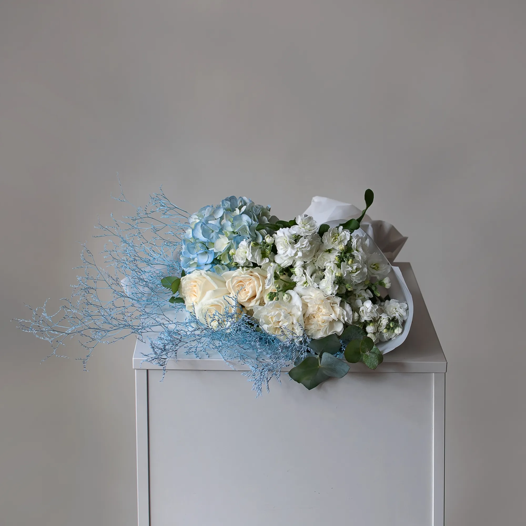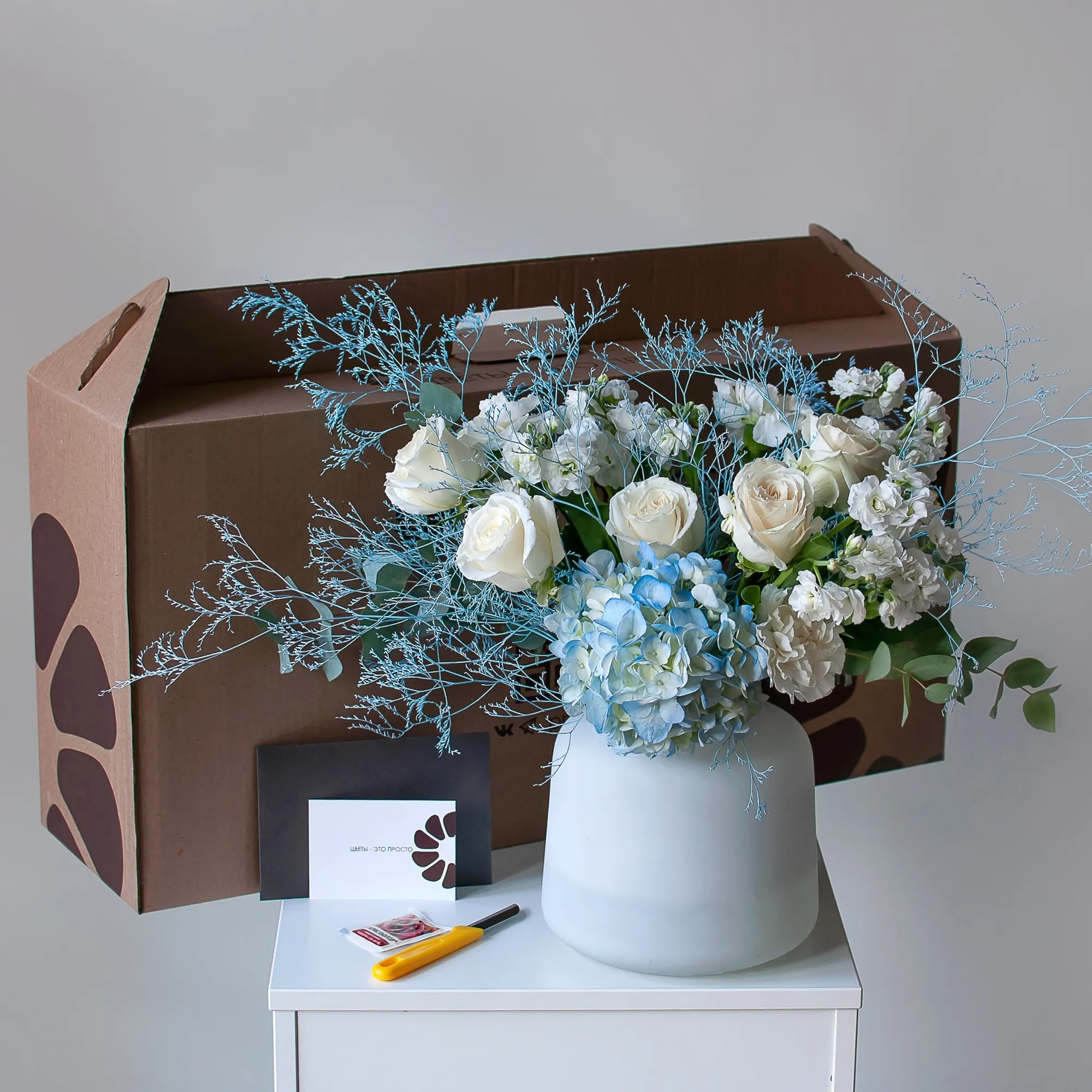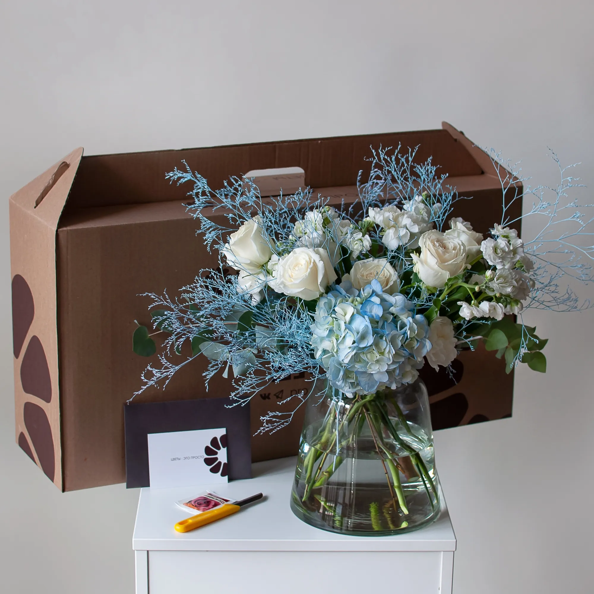 В букете №4 умиротворяющее сочетание небесно голубой гортензии, белой розы, ароматной белой маттиолы, гвоздики, крашеного голубого лимониума и веток эвкалипта. Вы сможете почувствовать себя в роли флориста и самостоятельно собрать букет как на фотографии. Или подарить эту возможность тому, кто давно мечтал сделать букет своими руками. В набор также входит флористический нож, инструкция по обработке цветов, конверт с открыткой и средство для продления жизни цветов.
