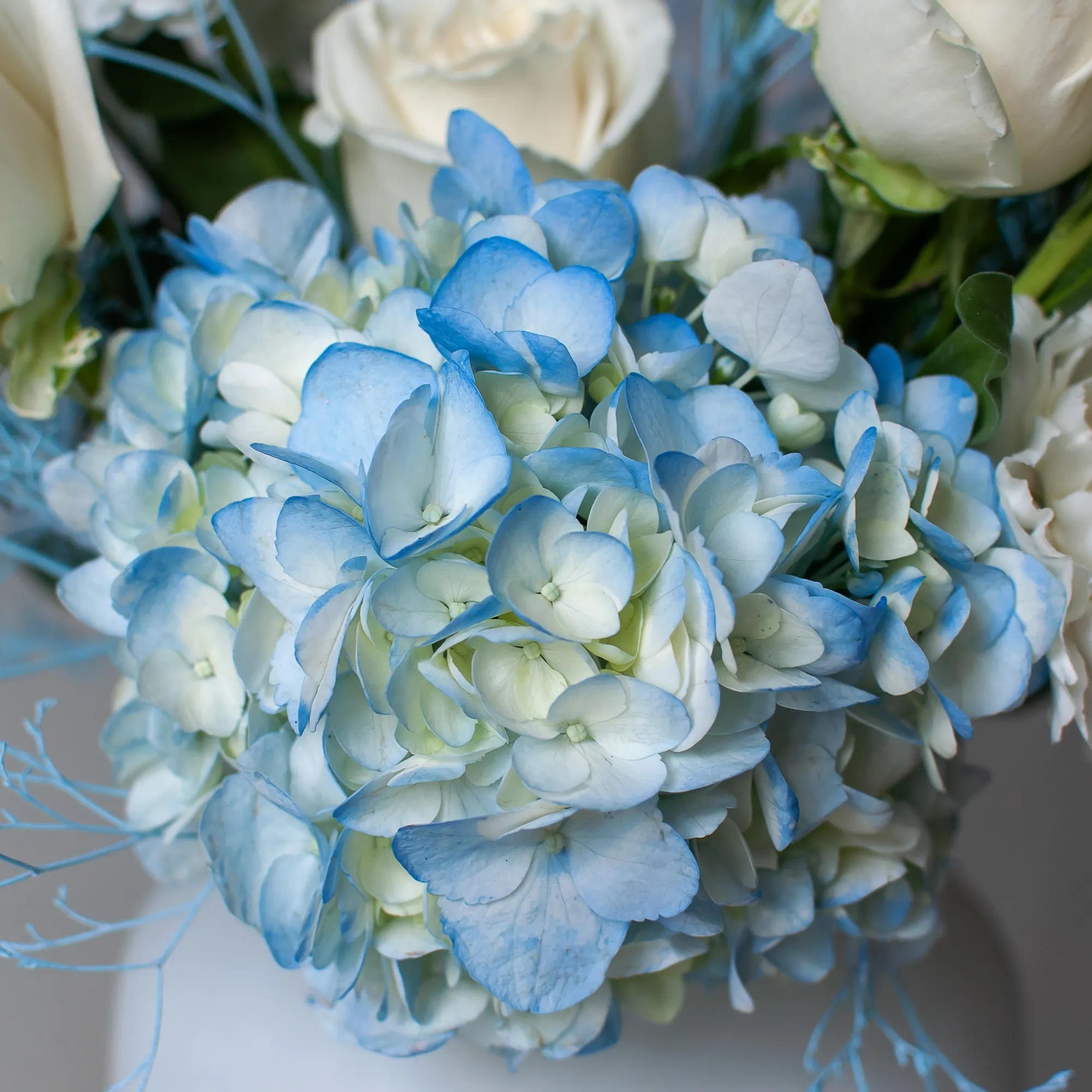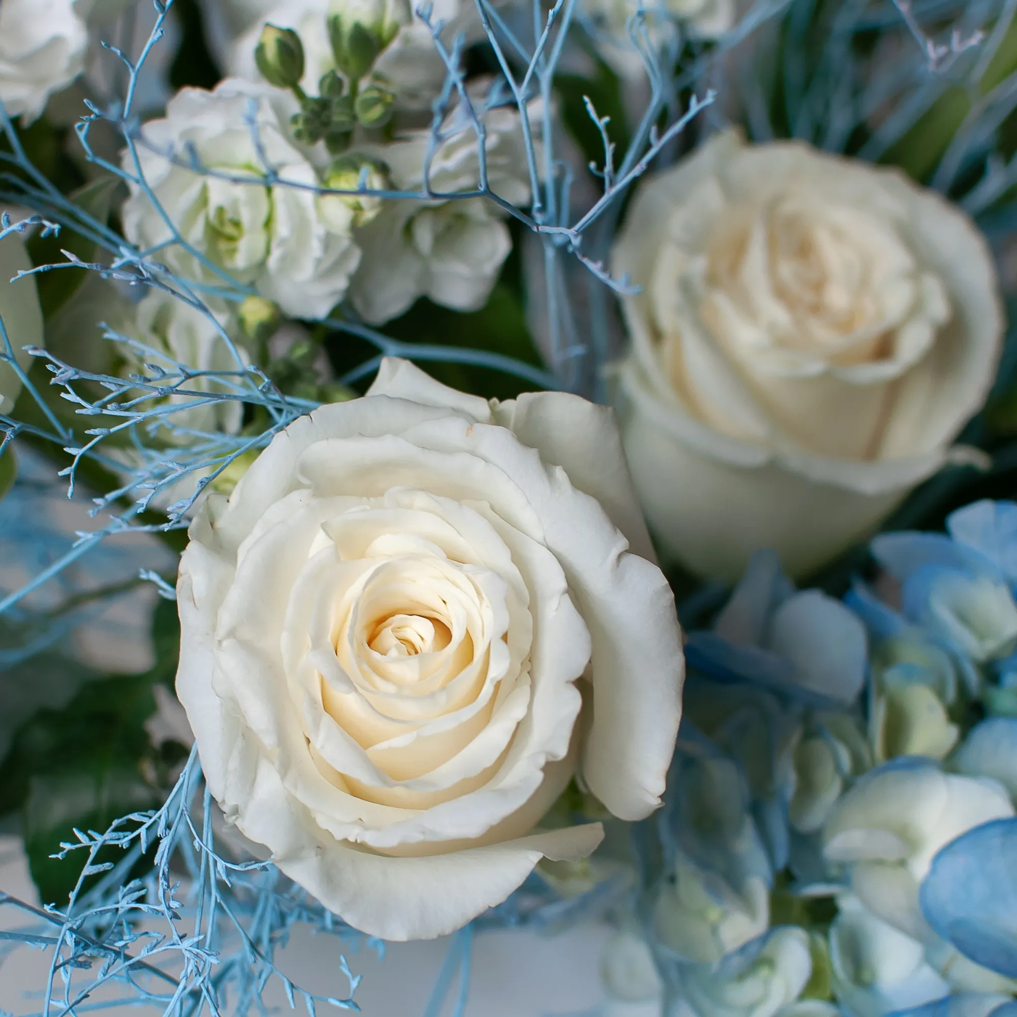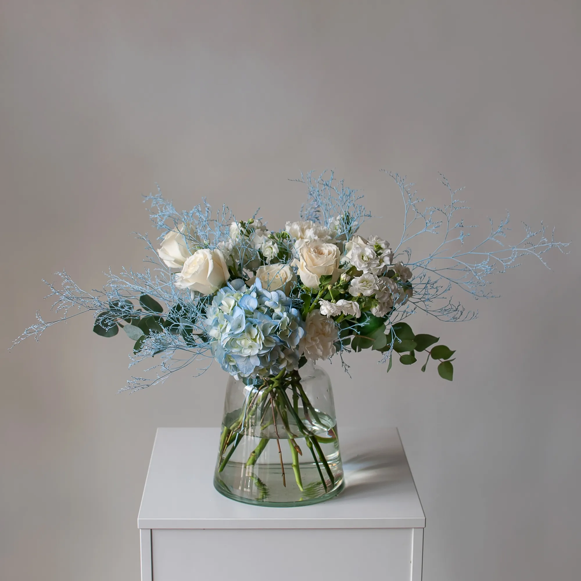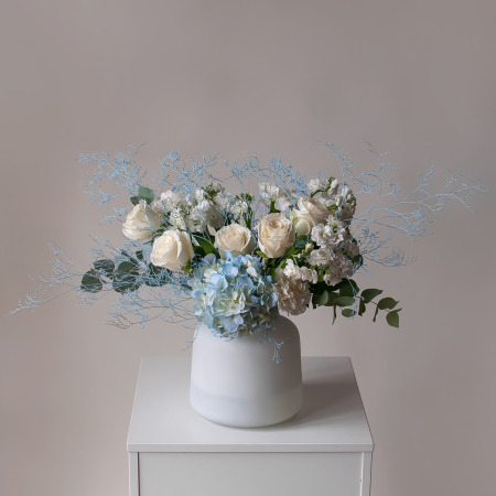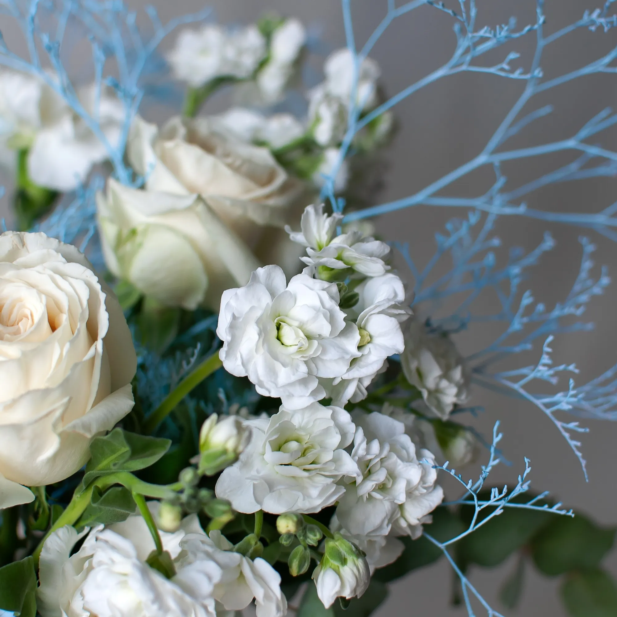 В букете №4 умиротворяющее сочетание небесно голубой гортензии, белой розы, ароматной белой маттиолы, гвоздики, крашеного голубого лимониума и веток эвкалипта. Вы сможете почувствовать себя в роли флориста и самостоятельно собрать букет как на фотографии. Или подарить эту возможность тому, кто давно мечтал сделать букет своими руками. В набор также входит флористический нож, инструкция по обработке цветов, конверт с открыткой и средство для продления жизни цветов.