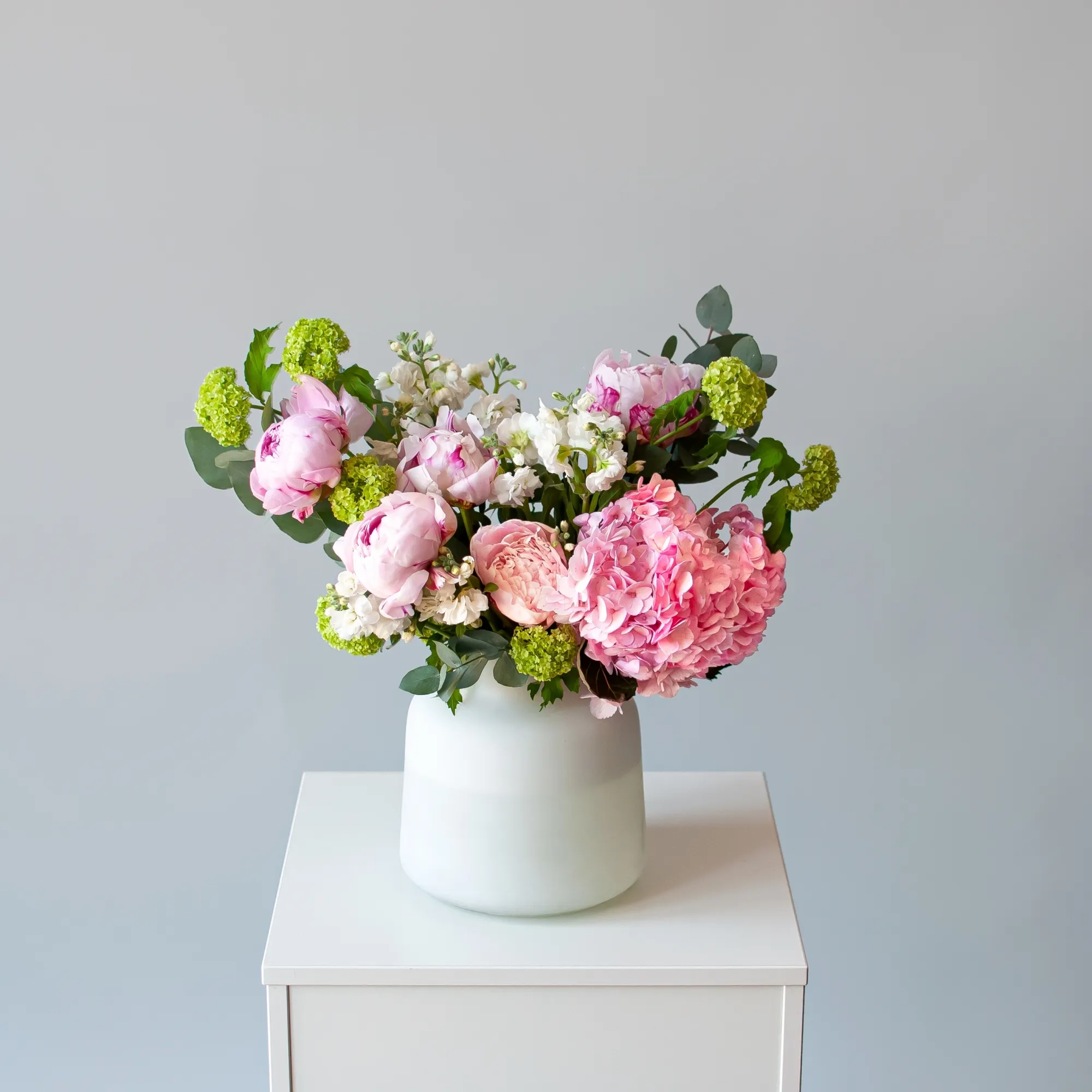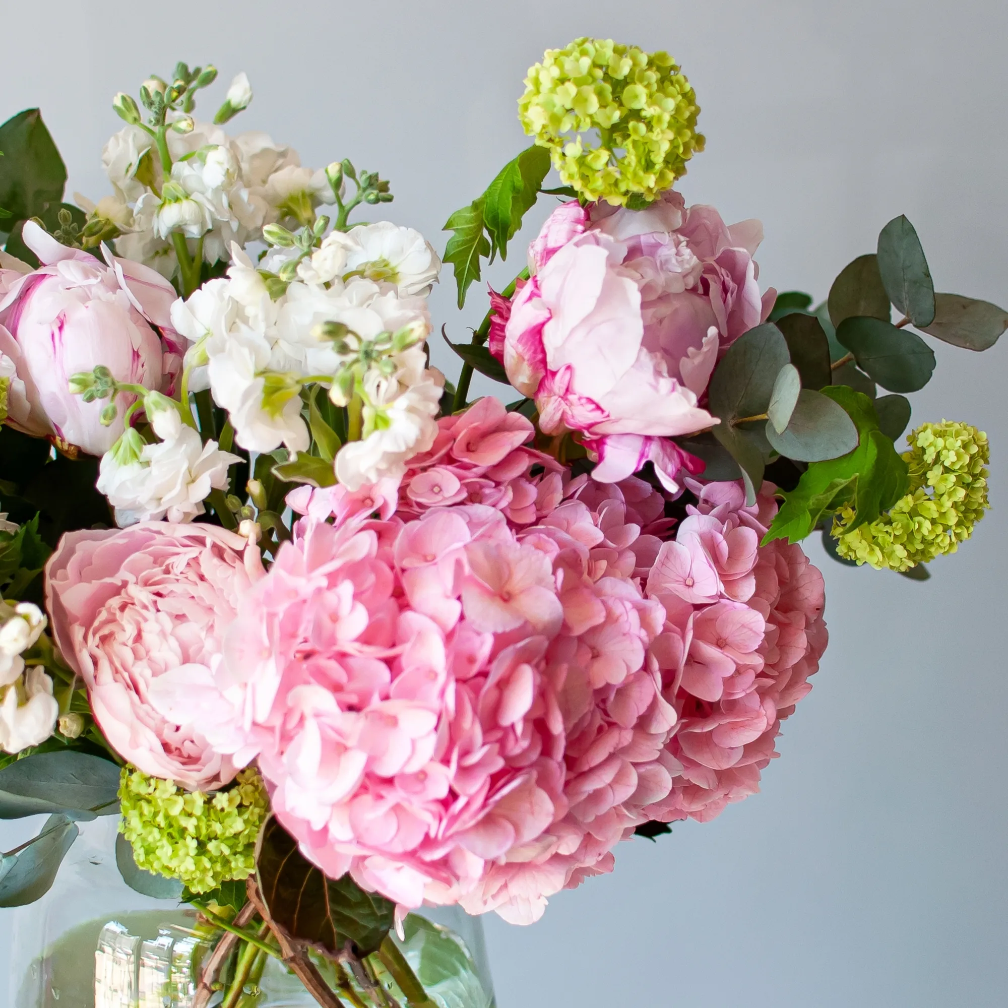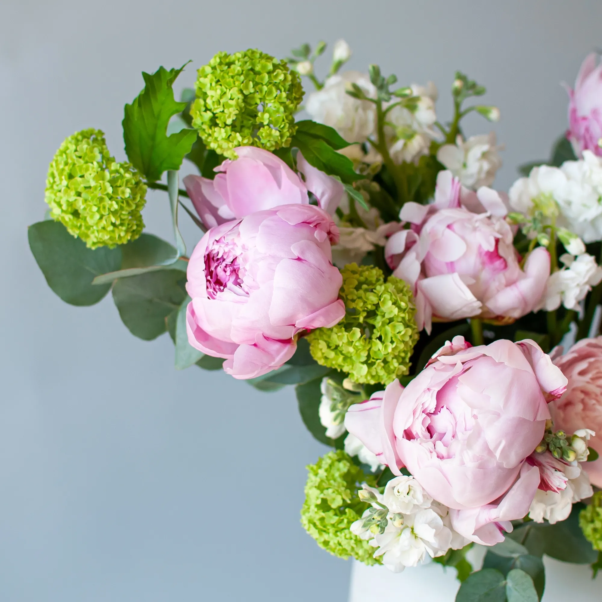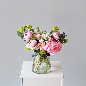 Букет №9 - это освежающий коктейль цвета мохито из фактурного вибурнума, кустовой белой маттиолы, розовой гортензии, пионов и листьев эвкалипта. Вы сможете почувствовать себя в роли флориста и самостоятельно собрать букет как на фотографии. Или подарить эту возможность тому, кто давно мечтал сделать букет своими руками. В набор также входит флористический нож, инструкция по обработке цветов, конверт с открыткой и средство для продления жизни цветов.