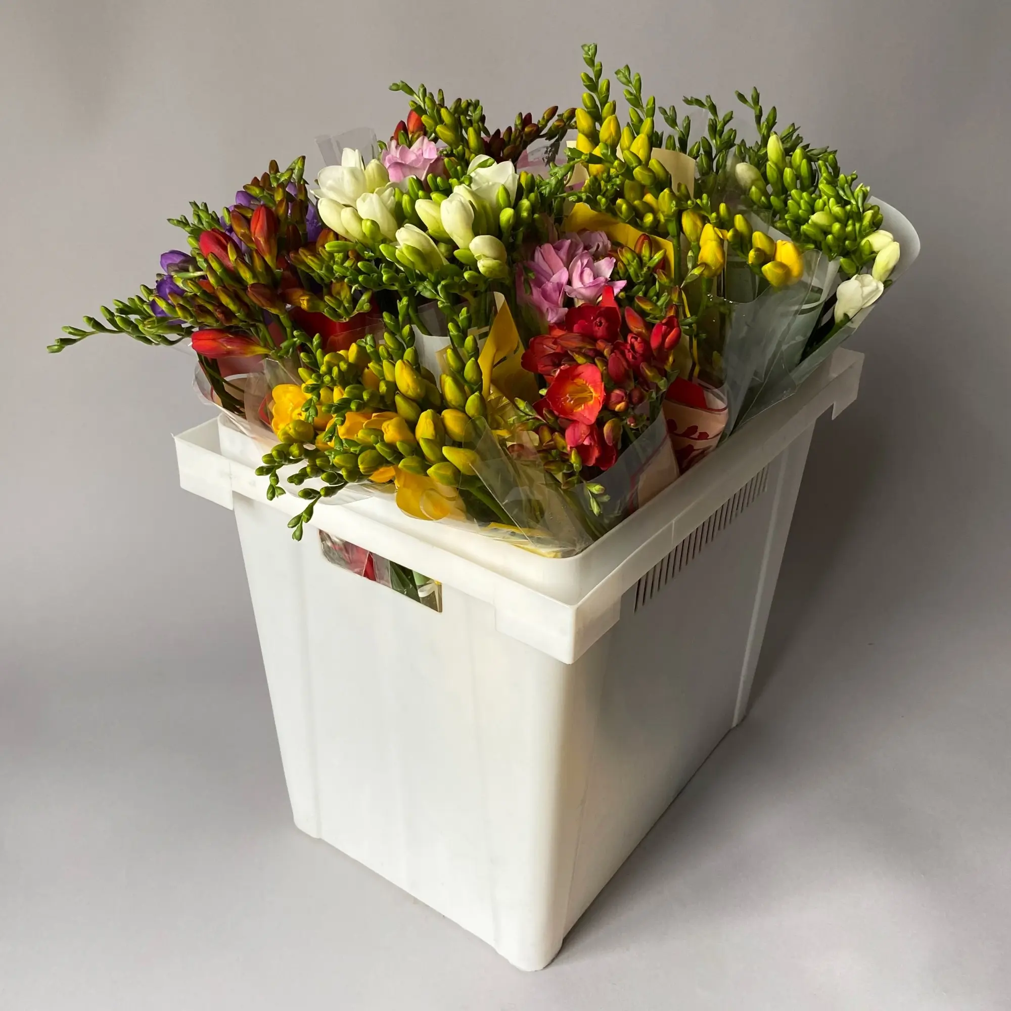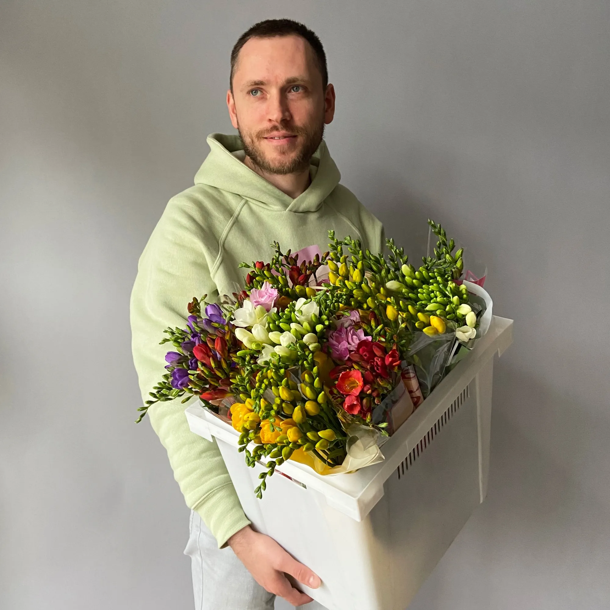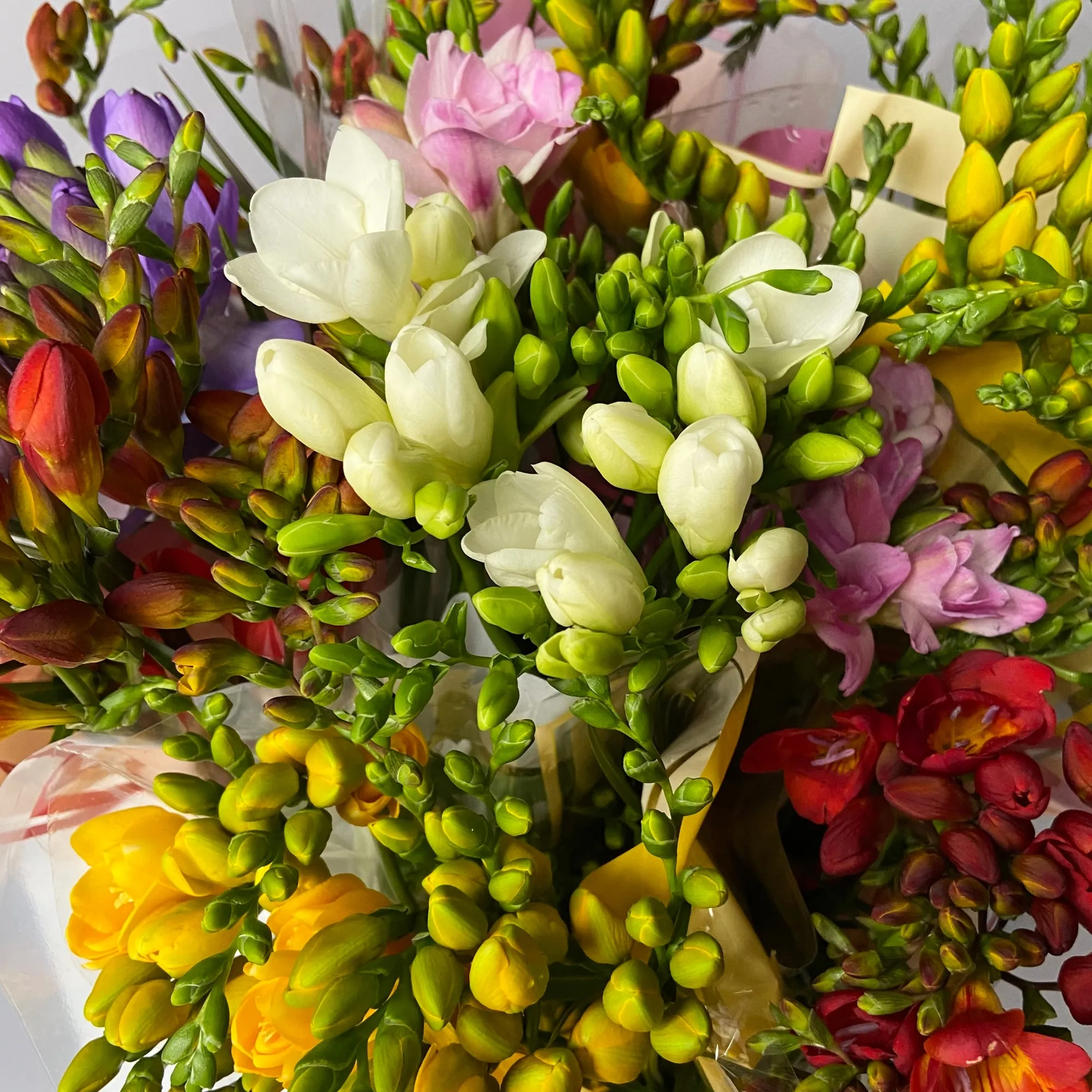 Обратите внимание, что вы приобретаете не готовый букет, а упаковку цветов прямо с плантации. Такие цветы предварительно не подвергаются флористической обработке. Не расстраивайтесь, если соцветие фрезии полностью не распустилось. Достаточно подрезать стебли на 1-2 см и поставить их в воду.