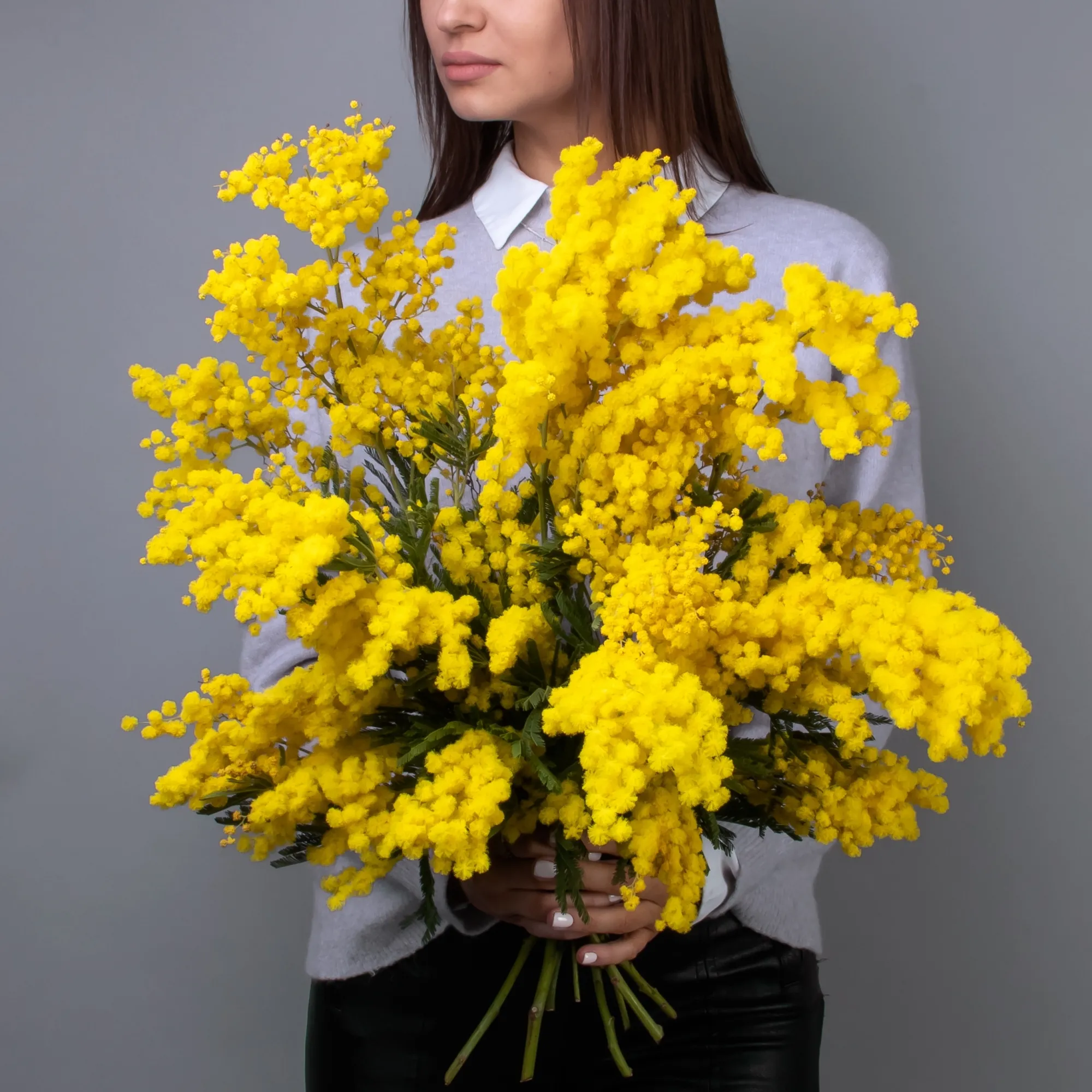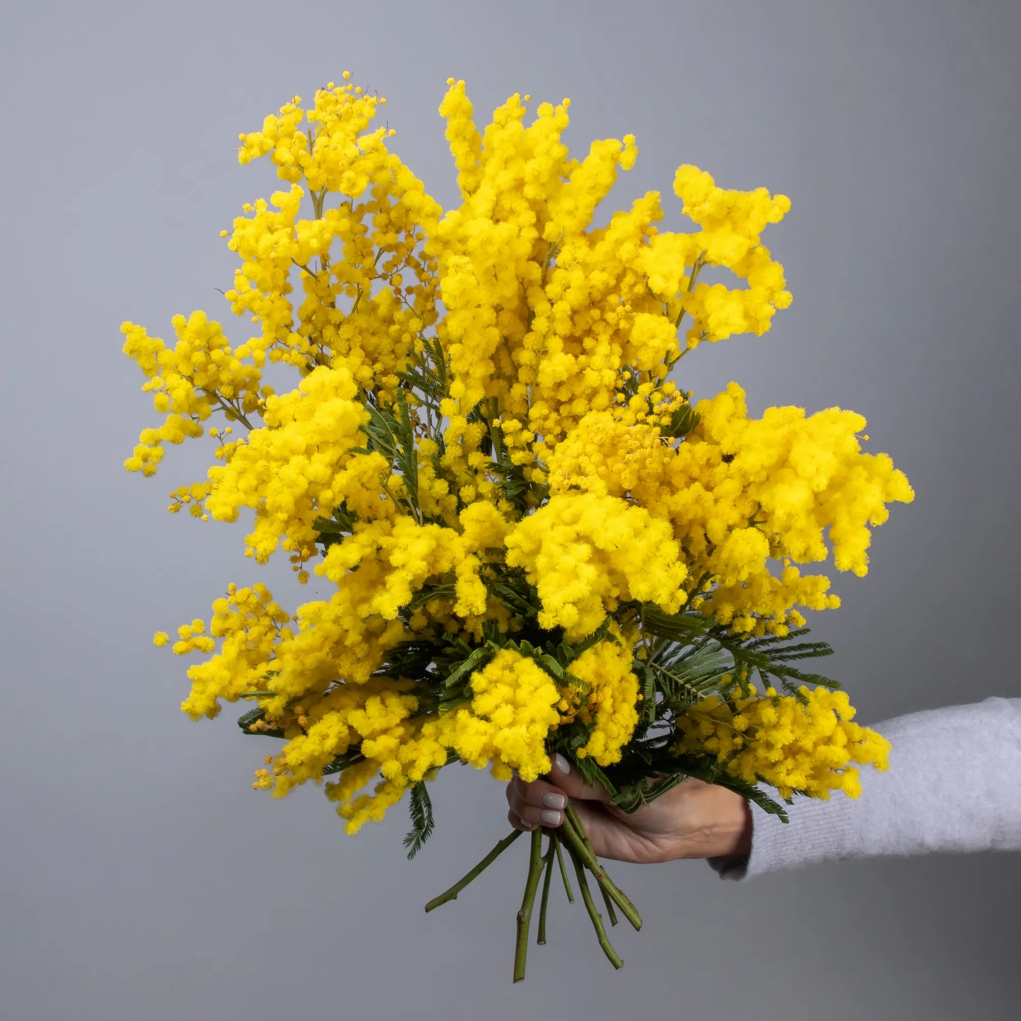 Итальянская мимоза в банче (пучке) может быть от 3 до 5 веток, в зависимости от их объема, общий вес составляет 400 грамм.