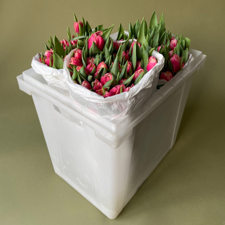 Наши цветы сорта «Ду Колумбус» приезжают в Россию напрямую с плантаций в Нидерландах. Для лучшей сохранности и экономии на услугах флориста цветы продаются в естественном виде, со всеми листьями, в защитной упаковке. Хранение растений и обработка заказов происходит в сухом кондиционированном цеху при температуре +4 градуса. Мы рады предложить удобную недорогую доставку по Москве и создать праздничное настроение в любой момент. Что особенно приятно, в нашем магазине цветов приобрести тюльпаны можно практически круглый год!